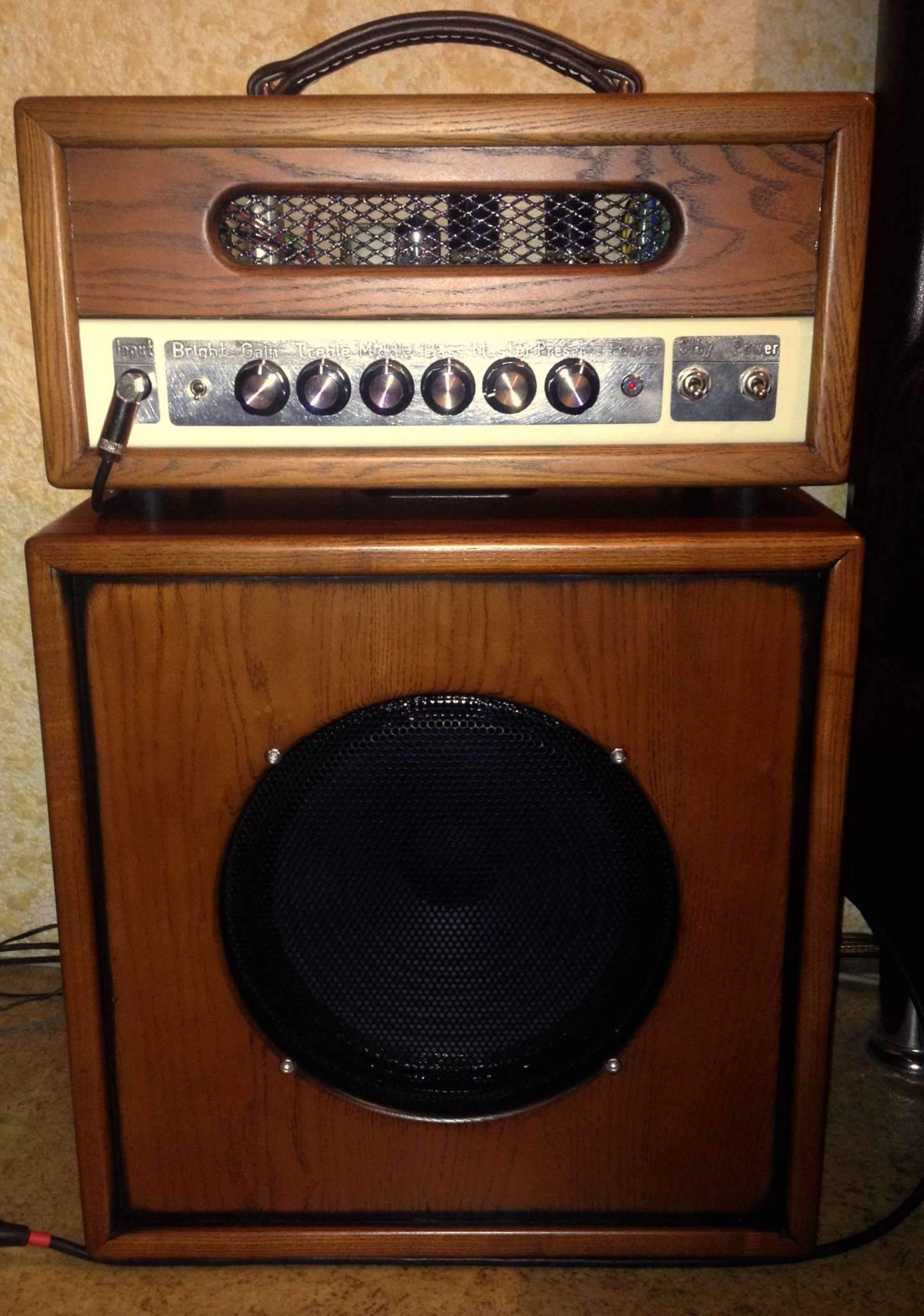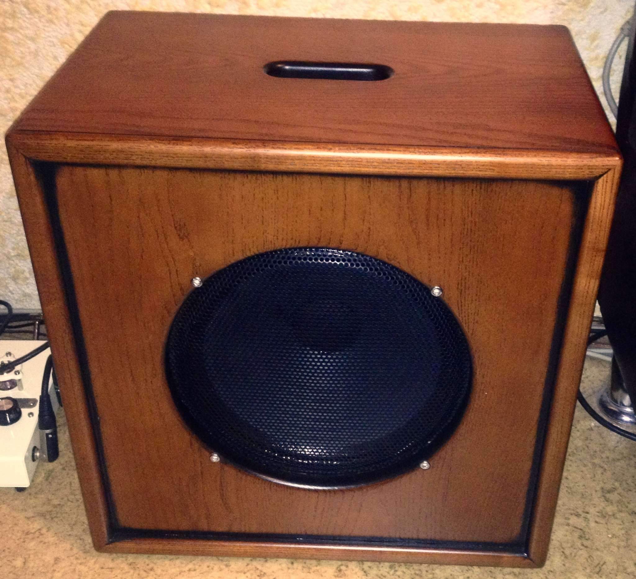 Звук каба мне понравился, его можно определить как басовитый. ФИ действительно даёт хороший упругий низ. А вскоре представился случай сравнить у знакомых на репе этот каб со 112 АМТ с VINTAGE 30. Несмотря на 10-дюймовый динамик, на малой громкости этот каб звучал даже плотнее и приятнее что на чистом, что на перегрузе, на средней громкости сравнимо, а вот на большой громкости увы начинал слегка мутить, АМТ-ка почётче. Правда это уже было на пределе его 30Вт, а может и за пределом. Понравился звук не только мне, ещё двое участников теста (один из них басист) захотели себе такой же. Пришлось делать для них чертежи. Не знаю, правда, пустили ли они их в дело.