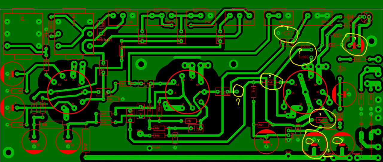Пятачки ECC88/ECC99 подразумевают перемычку под соответствующую выходную лампу. Сеточные резисторы ставь 5к6, как и есть. Ну а конденсатор для светодиода, думаю, емкость сам придумаешь)