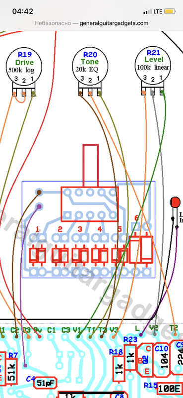 Остановился пока на переклюке зенер-диоды/без диодов (тоже клёво, мало гейна и громко)/красный+зелёный светодиоды. Регулятор гейна 1М, 220н перед тоном сделал переключаемым на 100н для пущей яркости звука. Но это я подгонял под свой сетап и другие педали, чтоб пользовать не в качестве грелки, а как самостоятельный овер.