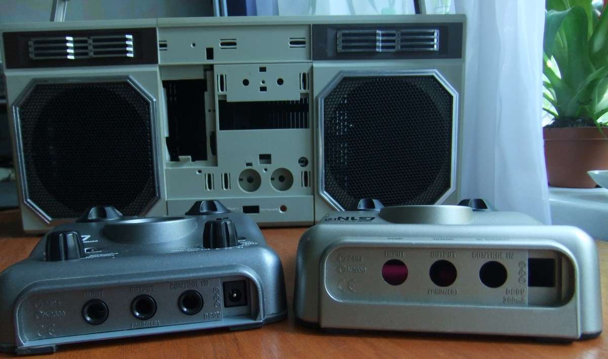 В угоду компактности и внешнему виду уменьшил длину магнитолы на 70 мм, тупо отпилив среднюю часть и склеив оставшиеся половинки. Оформил "карман" с выступающими буртиками, в который с натягом задвилается ЗУУм и двумя проводами (питание и линейный выход) подключается к магнитоле.