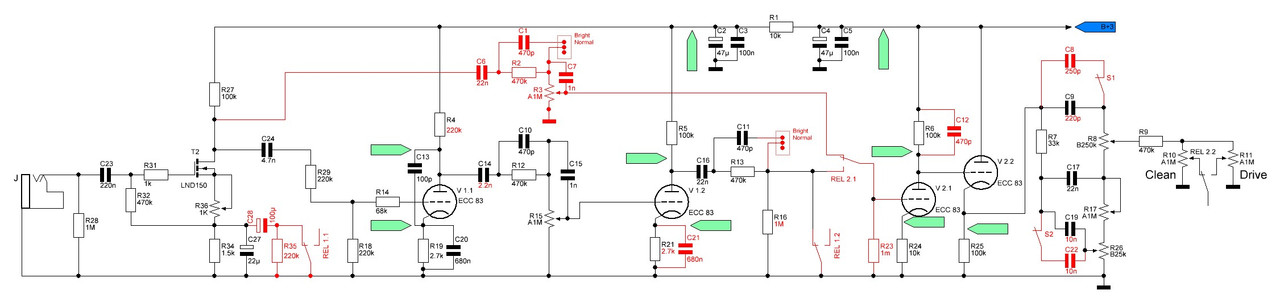 R4 валит крутизну каскада до лампового, и уже выбором R8/C3 мы ставим нужный звук. т.е. 1к5/22u, 2k7/680nF, 1к5/1U - это все работает как и с лампой.