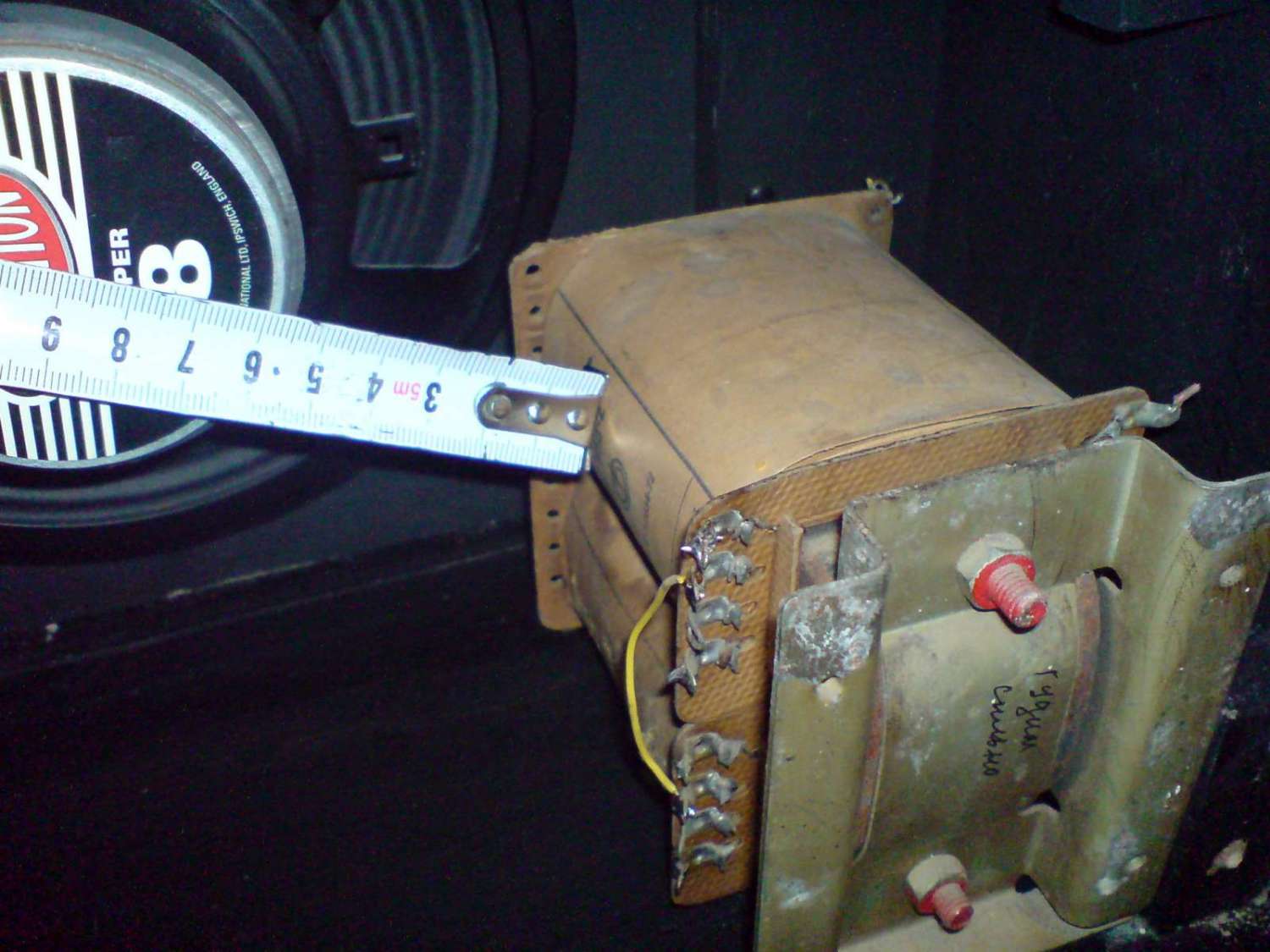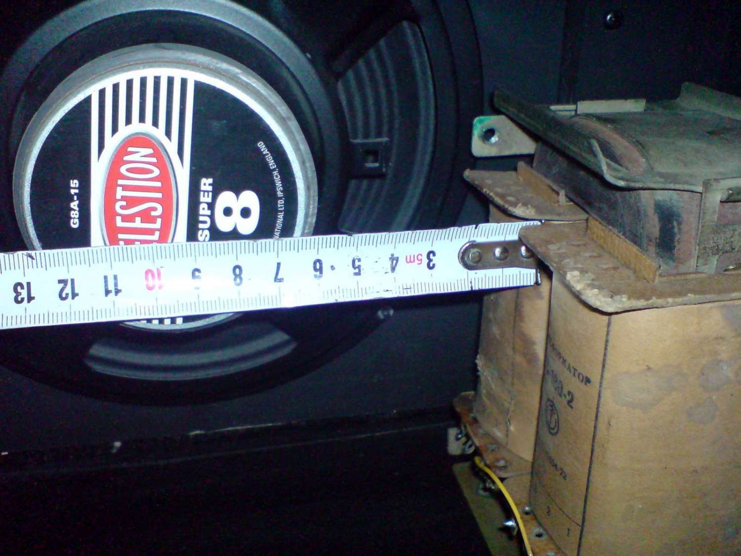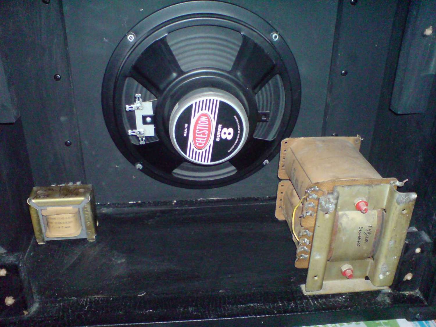 Добрый вечер, господа и товарищи. Собрал уже давно ламповый усилок Hi-Octane на шасси, и думал поначалу сделать его в отдельном корпусе, как голову. Но, фанеры, кожзама и прочей фурнитуры на корпус головы нет, а покупать стало дорого и далеко за этим надо ехать. Посему решил переделать шасси и поместить всю конструкцию в корпус комбика Kustom Arrow 16 c родным динамиком Selestion Super 8. Само новое шасси делаю из корпуса от компьютера, оно будет примерно по размеру идентично родному от комбика и крепится оно будет также вверху сзади, лампы будут смотреть вниз, ручки регулировки вверх, как и было на родном шасси комбика. Трасформаторы придётся установить внизу комбика прикрутив к его дну саморезами. Силовой транс ТС 180-2 (другого поменьше не имею), выходной ТВЗШ. Разместил трансы на дне комбика и муха сомнения поползла по тарелке моего ума. Расстояние от ТС 180-2 до магнита динамика 55-60 мм (в зависимости от положения транса), а не повлияет ли переменное магнитное поле транса на постоянный магнит динамика и не размагнитится ли магнит по прошествии некоторого времени, через месяц, год и или позже?