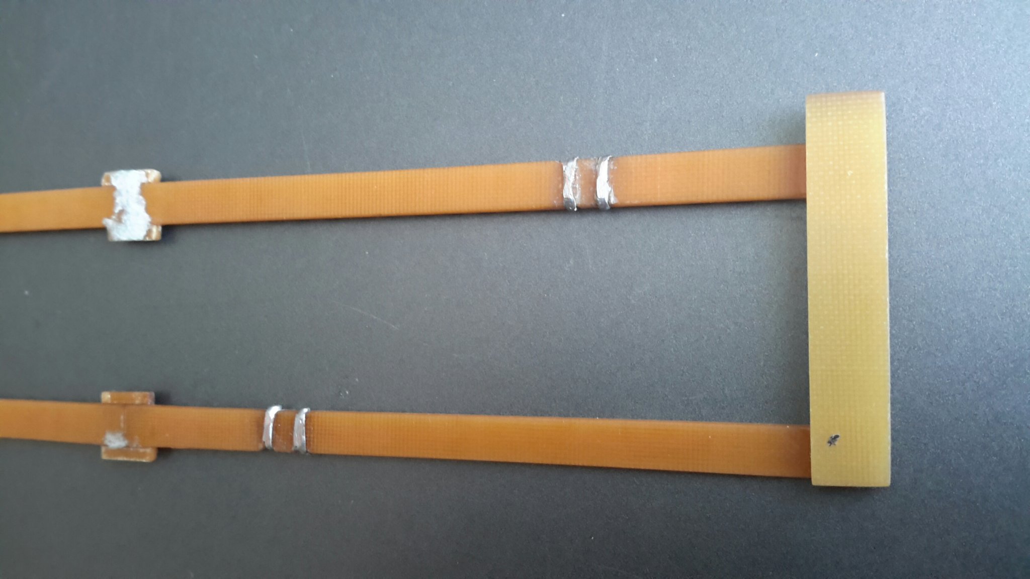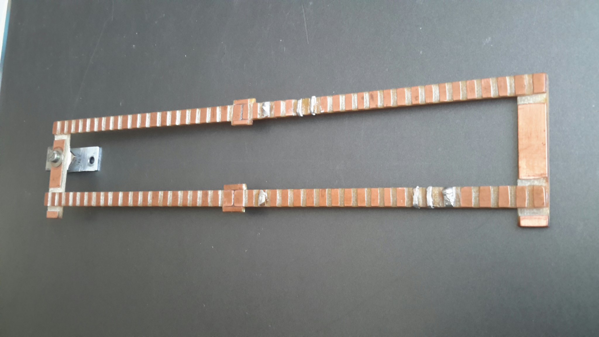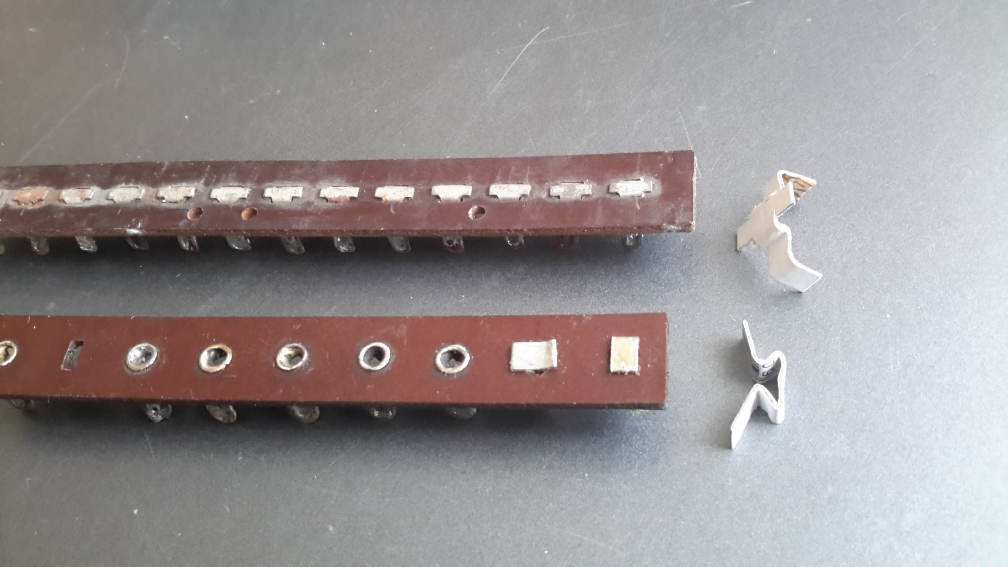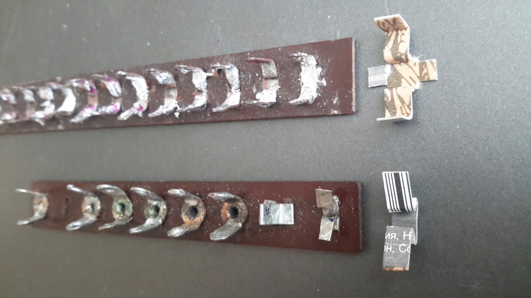 Есть прочные аккуратные скобы с покрытием цвета меди, которые используются в качестве крепежа картонной тары, удалив внешнее покрытие, убедился, что они хорошо паяются, имхо вполне сгодятся в качестве альтернативы полоскам из консервных банок и пивных крышек
