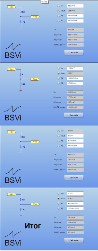 Так, а какая разница делитель то не зависит от напряжения, с таким же успехом можно переменник поставить, и все. Я так понимаю этот какскад усиливает чисто сильно уменьшенный сигнал и все. Если там максимум 50в то получается на выходе с делителя около 0,7в.