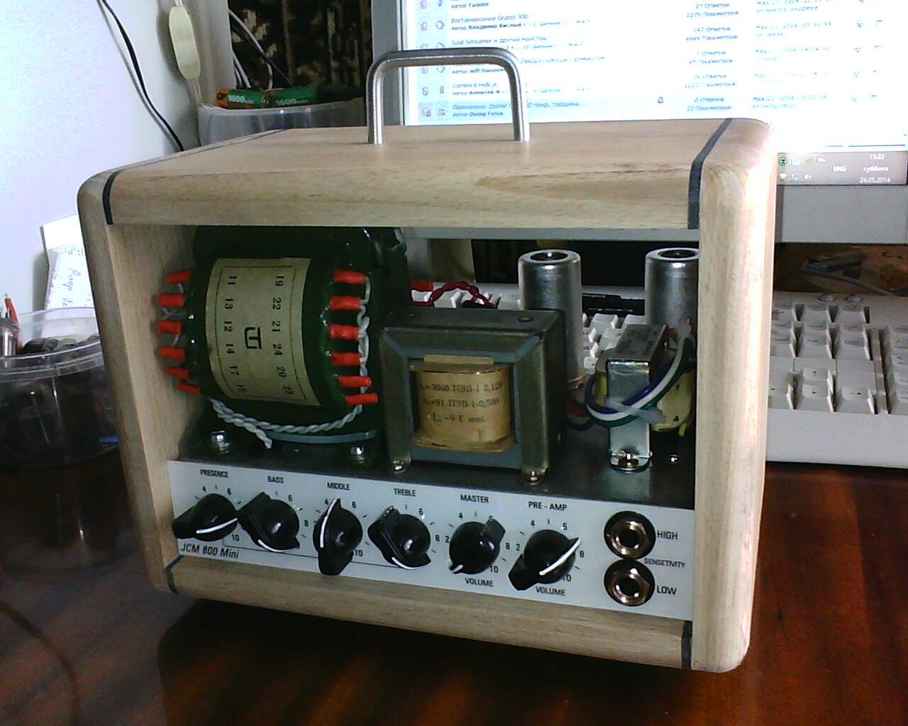 братцы, хочу посоветоваться. Вот такой корпус у меня вырисовывается, решил делать деревянный под матовым лачком. Дерево бук. Вопрос как сделать переднюю стенку. Можно выпилить из ламината под бук, будет симпатично, но несколько по колхозному, кмк. Можно чёрную металлическую сетку, но будут просвечивать трансы, особенно хорошо будет смотреться зелёный ТАН