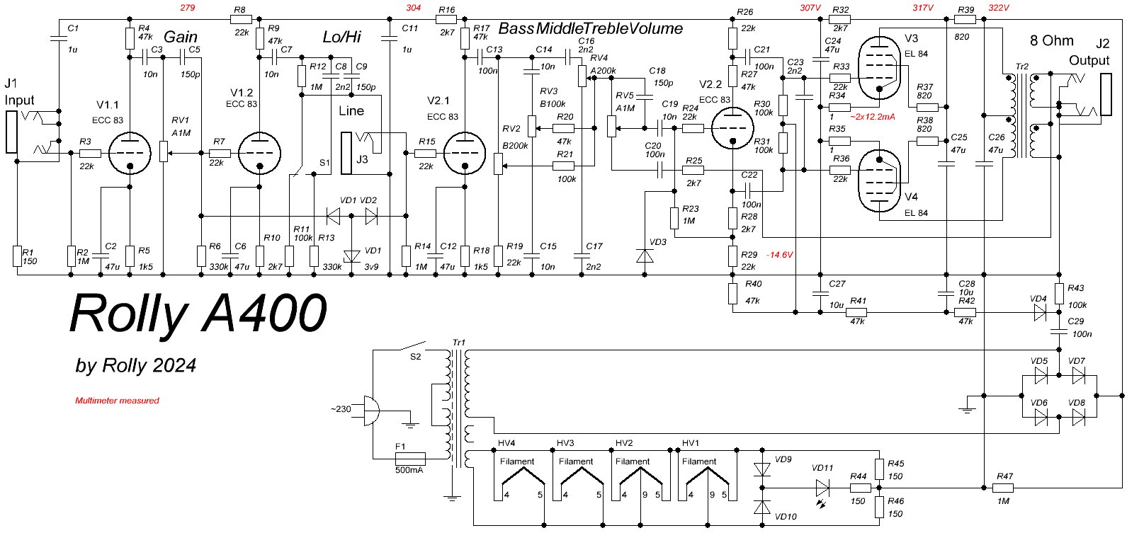 5.Добавлены диоды для ограничения отрицательных напряжений на сетках и запирания каскадов, но не добавляющие свой клипинг в звук.
