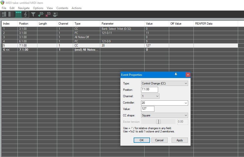 Скачал мануалы, соединил миди выход звуковой карты с миди входом процессора. В процессоре настроил так, как на скринах. Я так понял (для себя решил), что лучше установить MIDI Map Select в положение Fix, так меньше путаницы (хотя это и не точно). А дальше запустил Reaper, создал дорожку и на ней чистый миди файл. Зашел в Midi Take (в Cubase, по моему, это называется миди эдитор), переключил его вид в Event List и стал там прописывать события. В принципе, переключения патчей я добился (см. скрин), в 3 такте на первой доле включился патч 03-2. Интересует возможность переключения параметров в самом патче (вкл-выкл гармонайзер и т.п.). Если кто знает, как это делается, то можно скинуть скрины или просто написать сам порядок действий.