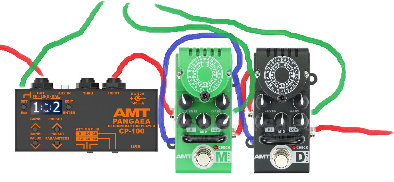 Красные кабели - сигнальные, синие - управляющие (для переключения преампов по разъёмам Ctrl-A и Ctrl-B), зелёные - 12В от адаптера питания.