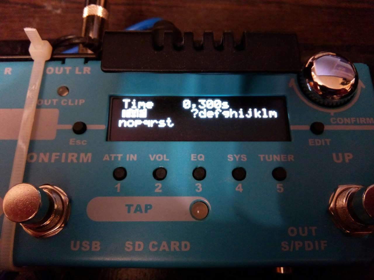 4. Тапаю по кнопке CONFIRM - эффект Delay пропадает, а через 2-4 секунды пропадает звук совсем, при этом индикатор TAP не горит, а индикатор out clip постоянно горит красным.