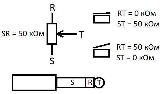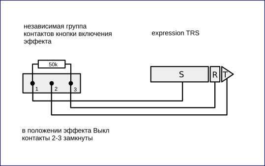 Все ж на рисунках видно. Подключаешь один конец кабеля с TRS-джеком в гнездо педали экспрессии Пангеи, к другому концу припаиваешь кнопку. Коммутация кнопки показана на рисунках. Желательно, но не обязательно добавить резистор на 50 кОм. Т.о. получаем эквивалент педали экспрессии в крайних её положениях: Min и Max, что соответствует состоянию эффектов Пангеи Off и On.