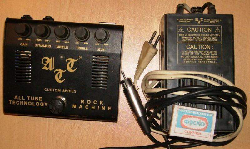 Дали мне поиграться аццкую древнюю примочь под названием ATT Rock Machine. Педали не менее 10 лет, но звук клевый. Самое главное достоинство - активный байпас, который слега компрессирует и утепляет звук. Реально, включиться напрямую в комб после ТАКОГО байпаса уже не хочется. Педаль очень прозрачно звучит даже на максимальных уровнях перегруза. Звук похож на JCM800. Внутри педали - 4 лампы! 2 - стандартные 12АХ7 и еще 2 - более мелкие, неопознаны, так как полностью выкрашены черной краской. Назначение этих ламп тоже неясно. Короче, одни вопросы. Что это за педаль, что за разработка, что делают черные лампы, что это была за контора - ATT, куда она делась, где можно найти продукцию этой фирмы? Кстати, нашел ссылку (древнюю) этой конторы