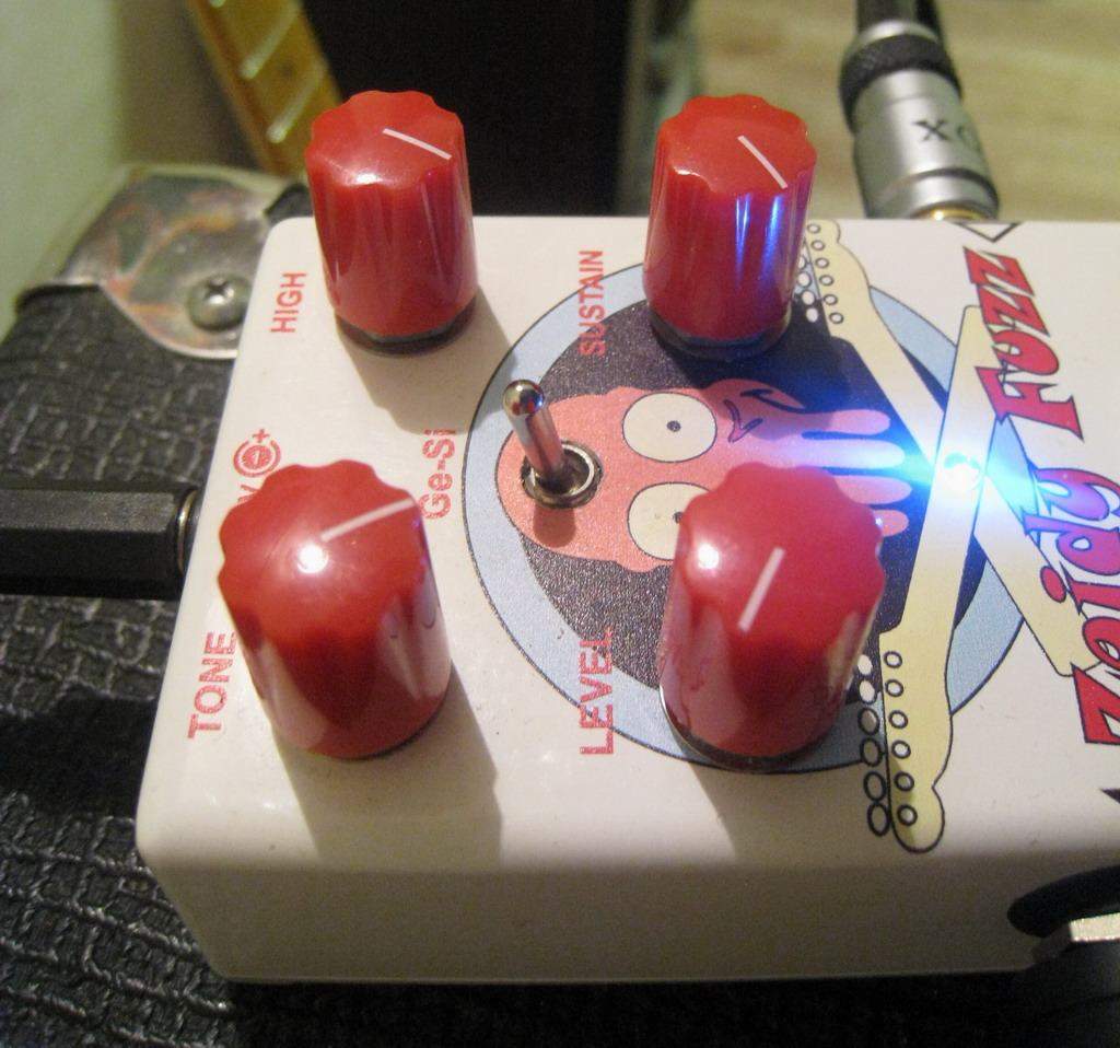 Tone – общий регулятор тона, High – регулятор уровня высоких частот, Level – регулятор уровня выходного сигнала и Sustain – регулятор уровня фузза. Так же имеется тумблер для включения транзисторного клиппинга силиконовыми транзисторами и германиевыми. Фиг его знает, что такое, но звук меняется заметно )