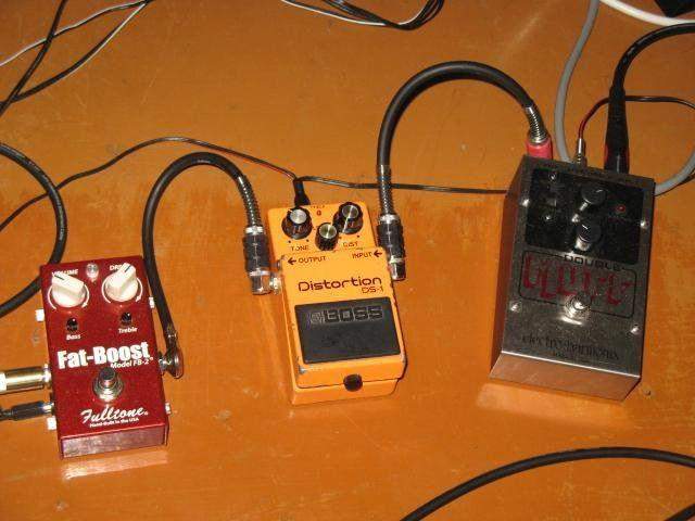 признаюсь оч долго возился с коммутированием своих педалек (наверно из-за сочетания импедансов). В итоге пришёл к такой цепочке - гитара - duble muff - boss ds-1 - fulltone fb-2 - cry baby gcb-95 - комбик. По звуку нормально сочетаются, см. пример. Очень хорошо можно отстроить связку рифф-соло - сделать соло "пожирнее-плотнее".