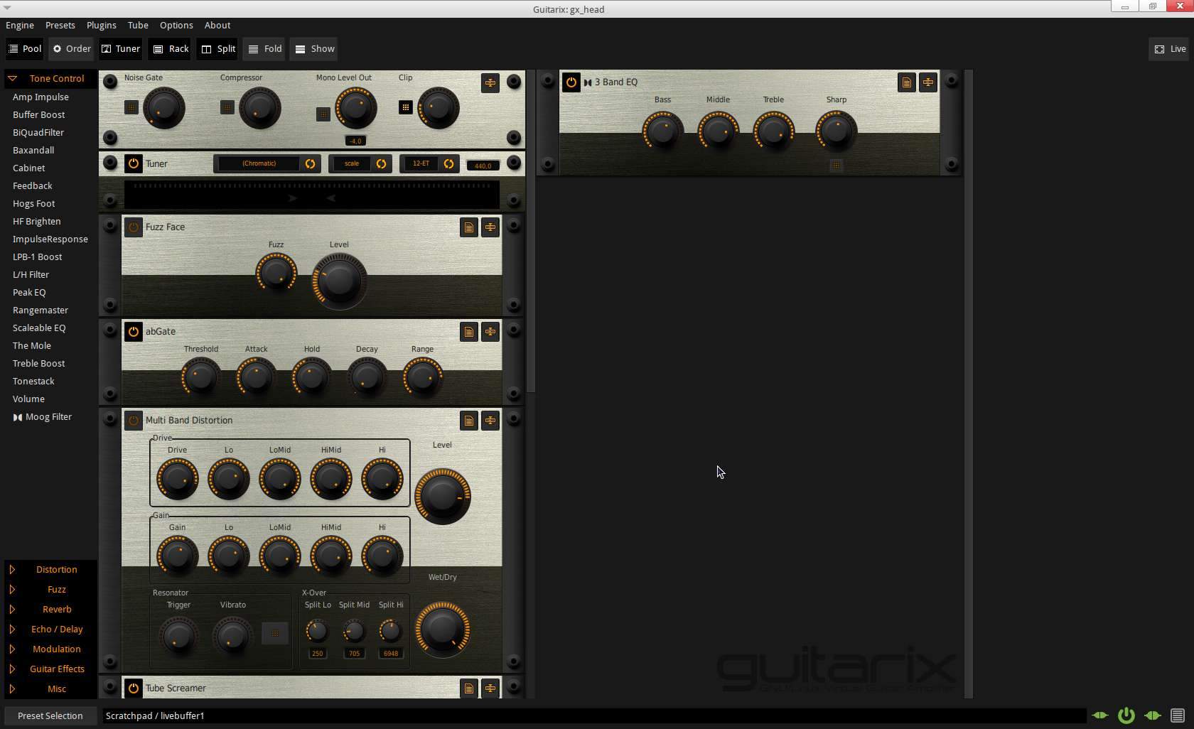 Откликается на игру Гитарикс довольно динамично и, хотя до реально лампового звука ему далеко, весьма неплохо звучит. Все параметры процессора имеют достаточно гибкие настройки, порядок цепи эффектов изменяется перетаскиванием, есть возможность загружать и сохранять пресеты, а также дополнительные LADSPA/LV2 эффекты.