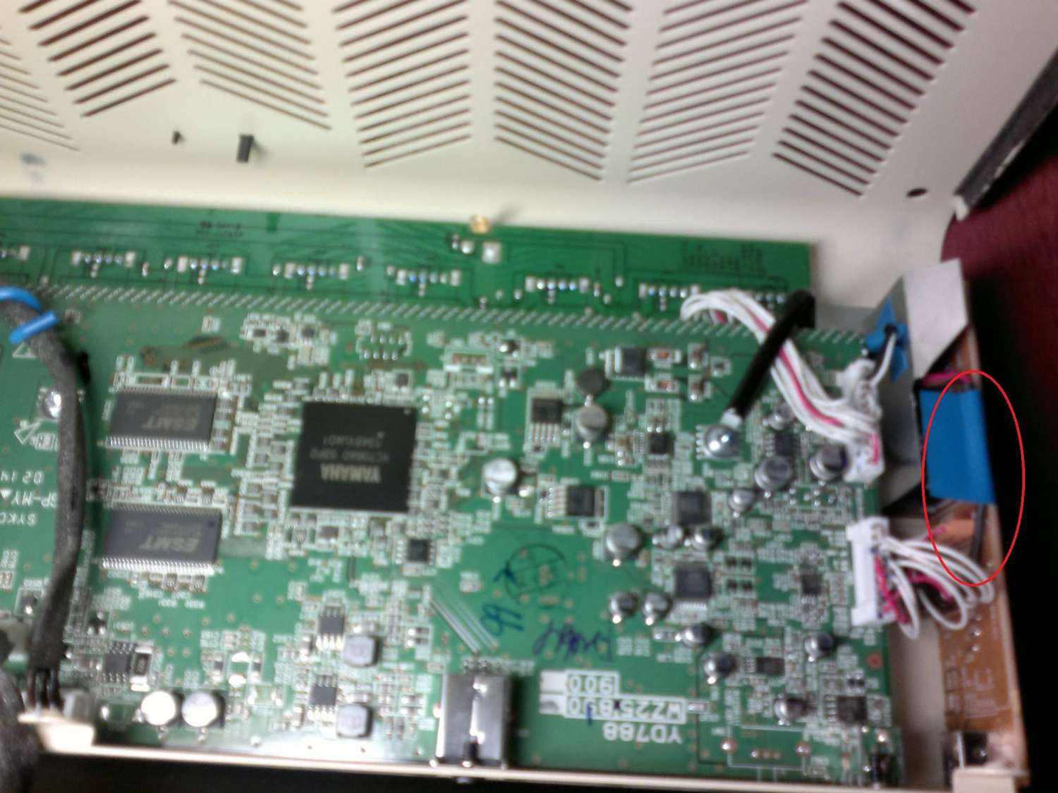 p.s. Если кому попадется пищалка, то не спешите освобождать от клейкого поролона жгут проводов. Попробуйте для начала подальше убрать пару проводов в черной термоусадке (обвел красным), которые идут за фольгой, подальше от указанного на фото жгута в поролоне. Мне помогло.