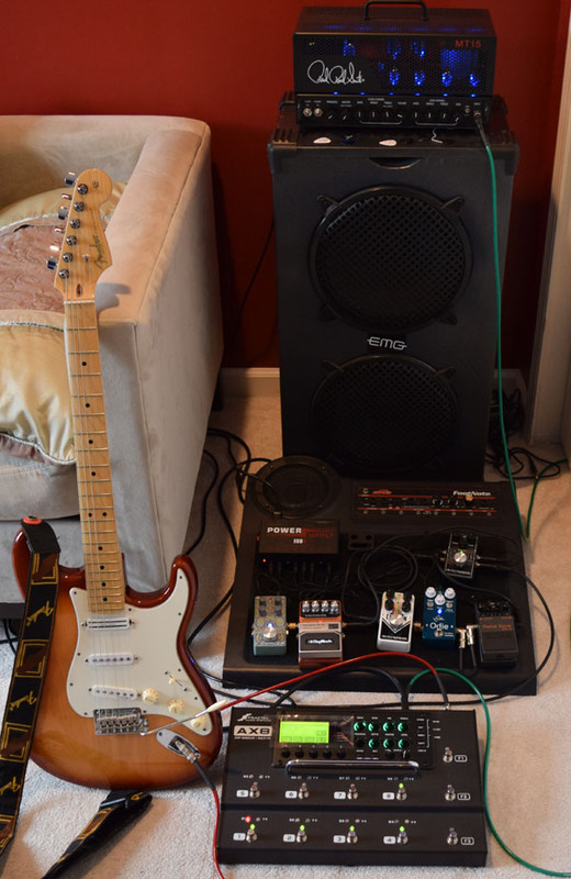 А сейчас этот JCA у меня в паре с MT15 в стерео-варианте, используются только чистые каналы, а сигнал на два усилителя раздаётся с последнего устройства в педал-борде - ревера DigiTech Polara, который сам тоже стерео.