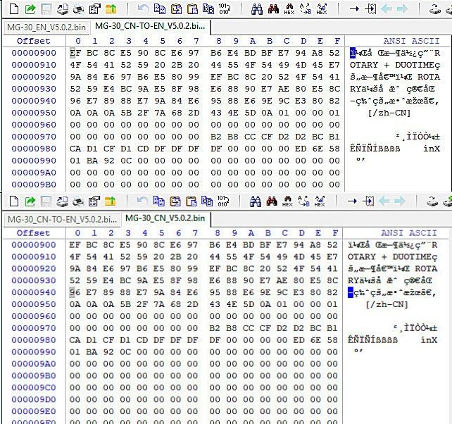 Скачал прошивку MG-400 китайскую и английскую и посмотрел их в WinHex. Те строчки, которые предлагает Никандров поменять в обоих прошивках, одинаковые в обеих: B1 AA A7 B2 B8 D2 CC CF и соответствуют EN региону. Значит ли это, что MG-400 на китайском языке не существует?