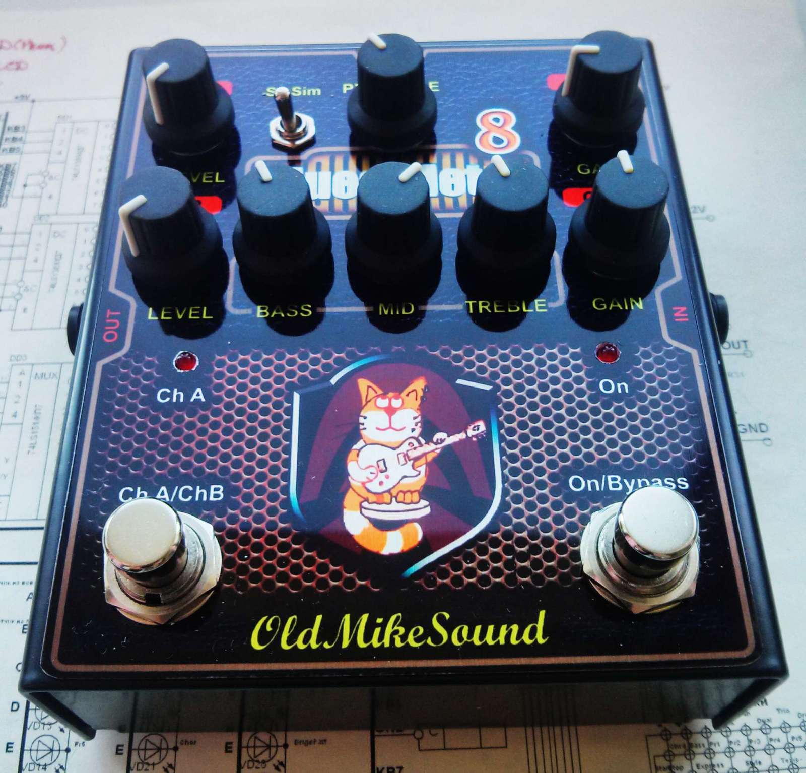 Это именно примочка - т.е. двухканальный перегруз с байпассом (байпасс у меня везде активный, но добротный). Прибор для педалборда, рассчитан на включение в инпут клинового канала усилителя. Каналы примочки одинаковые совершенно, что не мешает настраивать их гейны совершенно независимо, несмотря на общий темброблок: все сделано так, что на разных гейнах тембр крутить практически не нужно - верх хорошо сбалансирован по всему диапазону гейна (обычно с добавлением гейна хочется прибрать верх и наоборот - звук на разном гейне имеет разный гармонический состав, но у меня это предусмотрено