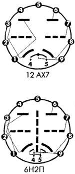 А чтобы поменять 12АХ7 на 6Н2П , нужно в розетке провод от 9 отпаять, разъеденить спаянные 4 и 5, и один провод кинуть на 4 , а другой на 5 , и 9 заземлить...Это если напряжение между проводами накальными 6,3 В