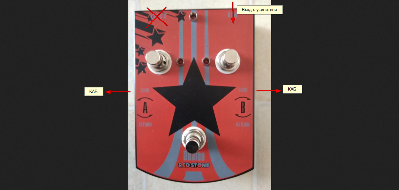 Тогда ставь одинаковые усилки с разными кабами и переключай этой педалькой входы усилков.