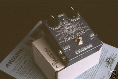 Analog Man Stereo Clone Chorus, это результат того, как классика, которая всегда радовала может заставить следать ее еще лучше! Сам Small Clone прост и великолепен как и большинство педалей от Е-Н, но увы свитч Depth дает возможность только включить на все 100% или выключить совсем. Analog Mike сделал его более универсальным заменив этот свитч на потенциометр. Это дает возможно получить классический хорус или Lesley type модуляцию. Также Mike сделал его бесшумным использовав более качественный детали и shieldings. В большей степени я интересовался им из-за отличных отзывов о использовании его с дистрошеном. Это на все 100% оправдано! Тон дисторшена не меняется при его использовании! Там где большинство хорусов бустят верха и превращают звук в "вертящийся хаос", Analog Man Clone делает его более насыщенным и liquid. Для этих нужд Analog Man Clone лучшее что я слышал на данный момент. Увы, стерео режим не удалось проверить, но думаю он весьма неплох.