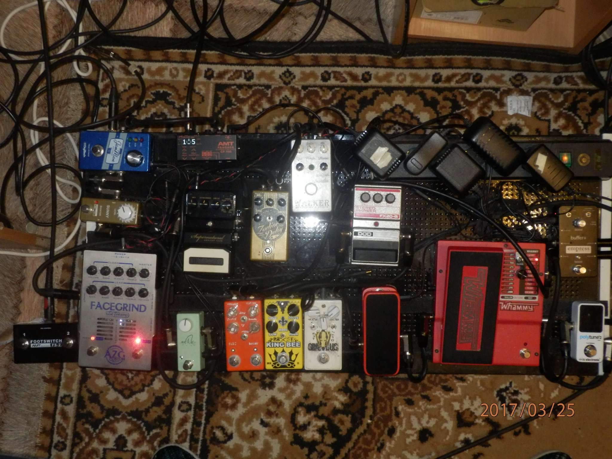 Гитара – Empress Buffer + (86mA) – TC Polytune2 mini (40mA) – Digitech Whammy 5 (265 mA) – Hotone Soul Press (Wah\Vol) (20mA) – DOD FX20-B Stereo Phaser (хз сколько ma – переделан под обычное босс-стайл питание) – Walker Screamer (15mA) – Walker King Bee2 (15mA) – Walker Fuzz\booster (15mA) (все это сидит в петле буффера) – преамп AZG Facegrind – Walker Delay Deja (35mA) – Walker Zodiac Delay (100 mA) – Digitech Supernatural (75mA) – Walker Reverb (100 mA) – Shift-Line Sunny Booster mini (25mA) – Digitech Jamman Express (150mA) – AMT Pangaea CP100 (140ma, 12V).