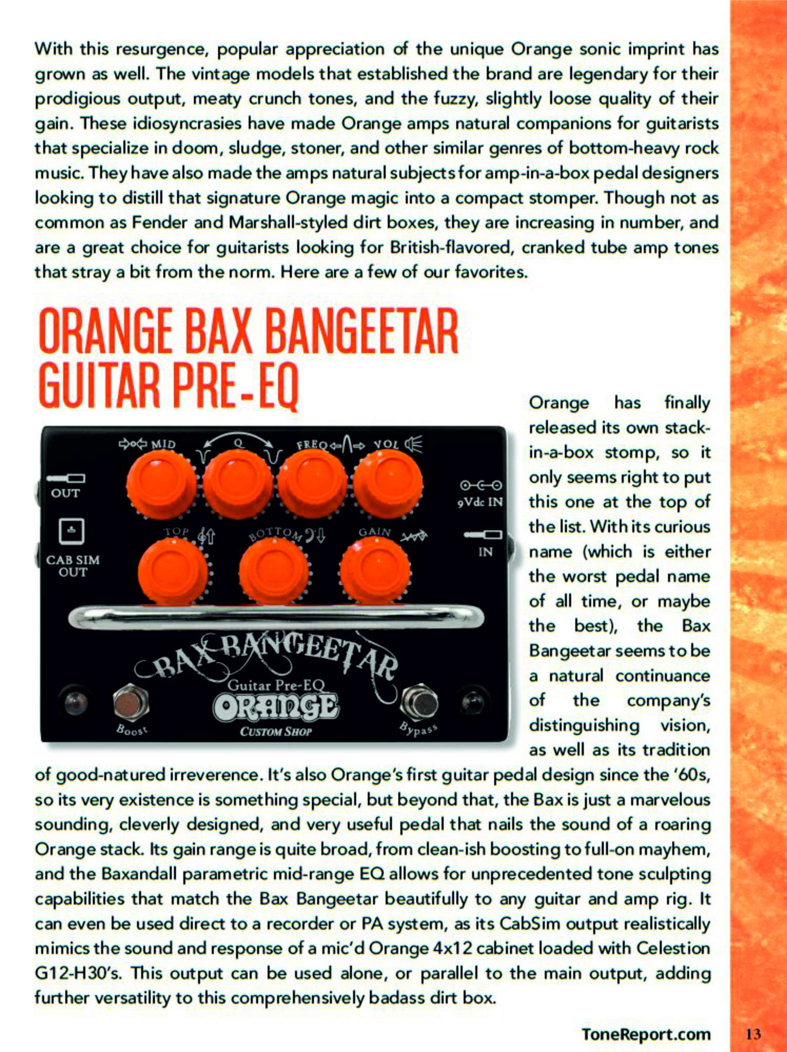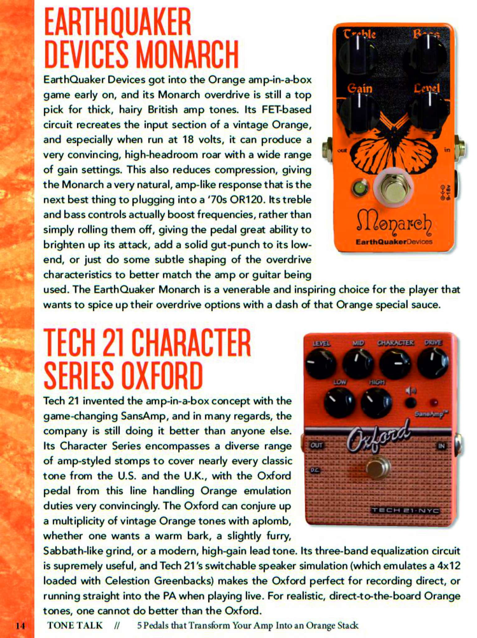 Гитаристы, которые целиком на пути Orange, вероятно купят один из прекрасных усилителей Orange, ну а для других, есть несколько педалей, которые воспроизведут ауру Orange при значительно меньших затратах и весе.