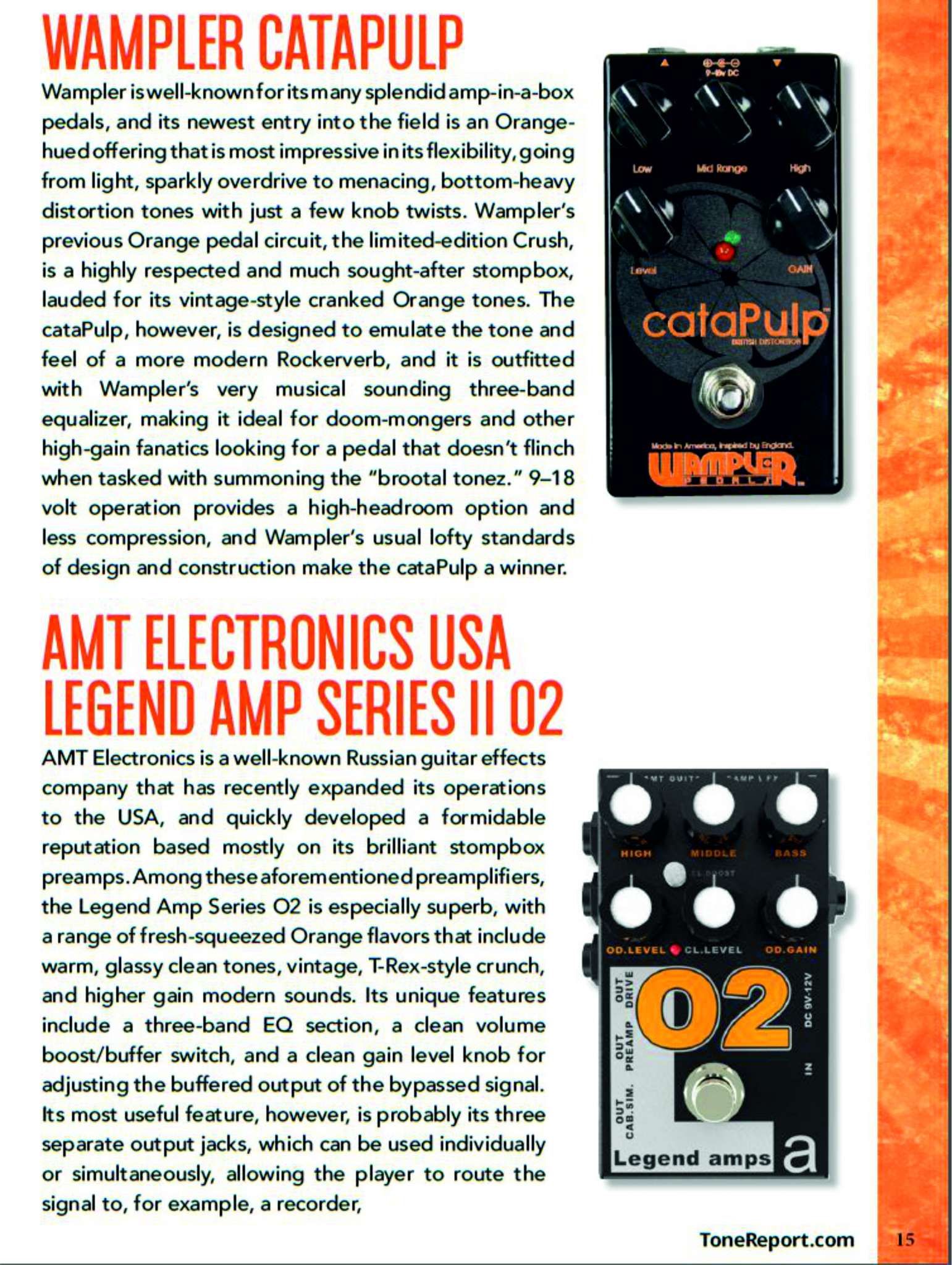 AMT Electronics, хорошо известная Российская компания, недавно расширила свою деятельность на США и быстро завоевала хорошую репутацию, основанную главным образом на своих превосходных stomp-box предусилителях. Среди этих предусилителей, AMT LA2 O2 особенно превосходен, с широким диапазоном свежо выжатых Апельсиновых (Orange) ароматов, который включает теплые, кристально чистые тона, винтажность, кранч в стиле T-Rex и Хай-Гейновое модерновое звучание. Его уникальные черты включают трехполосный эквалайзер, кнопка бустера уровня чистого канала, регулятор уровня чистого канала. Наиболее полезная черта, однако, это вероятно наличие трех выходных джеков, которые могут использоваться как по отдельности, так и одновременно, позволяя гитаристу направлять сигнал, например, на записывающее устройство, на усилитель мощности, на гитарный усилитель одновременно. Выход на записывающее устройство имеет также кабинет симулятор для создания очень реалистичного звучания. Эти черты делают из AMT O2 очень хорошего компаньона, при записи и живых исполнениях, для гитариста, который хочет иметь большие, плотные Orange тона, но не хочет таскаться с тяжелым оборудование, чтобы получить желаемое Orange звучание.