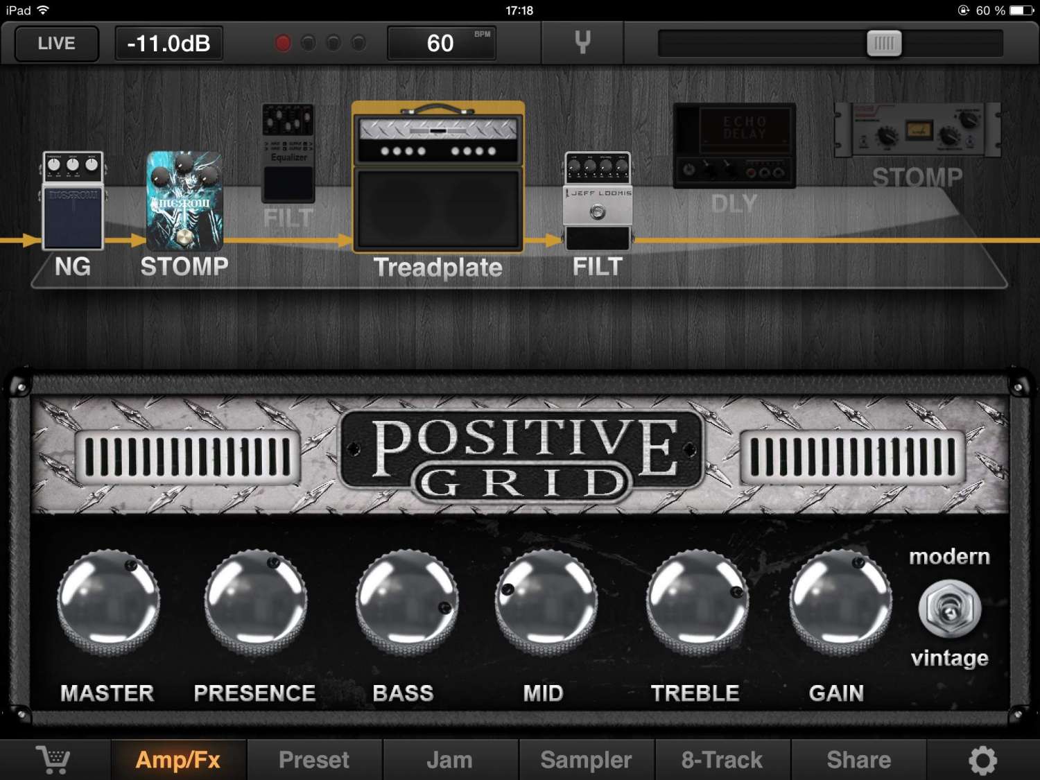 2. The Vintage Effects expansion pack - платный пакет из 8 примочек (стартовая цена $9.99, но если подождать должно быть дешевле). В принципе, по примочкам JamUp и раньше давал очень широкий набор, а теперь он как-бы стал еще шире