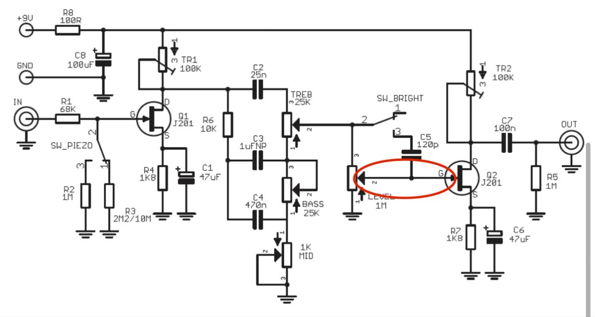 В общем спаял я преамп по схеме ниже, и он сильно шумит, я выявил что прикасаясь к проводу (отмечен красным) и крышке потенциометра громкости шум увеличивается. Что сделать, заземлить крышку? Тогда останется вопрос с проводом. В общем подскажите что вы думаете?😬😬