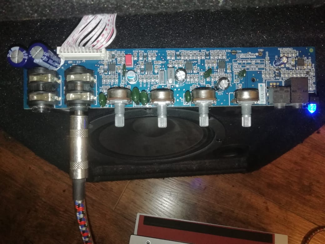 Комбик брал Б/У. Связавшись с продавцом уведомил его о данной проблеме так как в его руках комбик побывал у мастера, который заменил плату предусилителя по причине перегрева и высокачстотный динамик(при разборке я увидел что: диффузор родной пищалки склеен с основанием от другой, пищалка параллельно подключена к динамику через конденсатор-срез верхних частот). Узнал, что перед заменой платы симптомы были схожие, за отсутствием треска из динамика. После замены, по словам продавца, проблема ушла. Поэтому решил добраться до предусилителя. А выглядит он следующим образом: