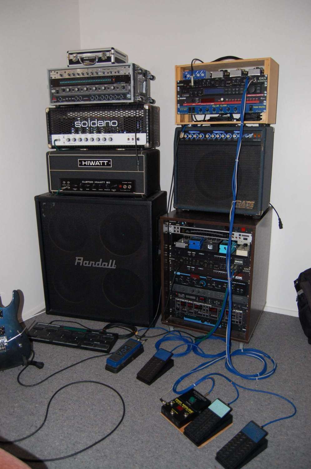 Если есть рек - то зачем тебе что-то под ногами? упакуй все в рек на полку и упавляй всем мидипереключалками - и процами и педалями... Вот мои здешние реки (домашний остался в россосисии) - здесь все управляется по миди, что большой что маленький.. Мелкий (который на блю вуде стоит) уже второй год вовсю таскаю на репы/клубы/джемы - ничего не отваливалось и никогда проблем не было. Управляется мидимаусом и двумя педалями экспресии - одна на громкость от VCA контроллера, а вторая - квак. Простой походный вариант - соединяется/подключается за 2 минуты, весит немного - я переношу один от машины до сцены (в одной руке комб, в другой - рек) и везде "твой" звук.