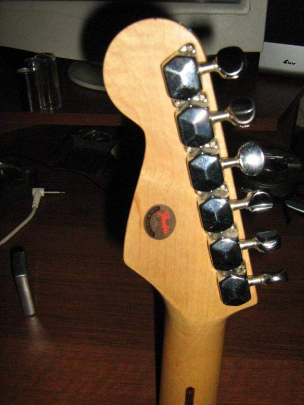 Справа не лево. Стратокастер 50лет Фендер 1996г. гитара звучит просто ломово, жирный смачнопузатый стратовский звук (датчики тексасы), одна беда - рычага машинки нет - на японцев, китайцев, хоть на страты с Марса - есть, а на Американца - нет нигде, если, кто слышал, где пргодают - буду рад. На грифе сзади медаль галографическая под лаком 50 лет Фендер. Естественно, что делалось ограниченным тиражём и современем приобретёт кроме музыкальной, ещё и коллекционную ценность(будет, что сыну оставить в наследство).
