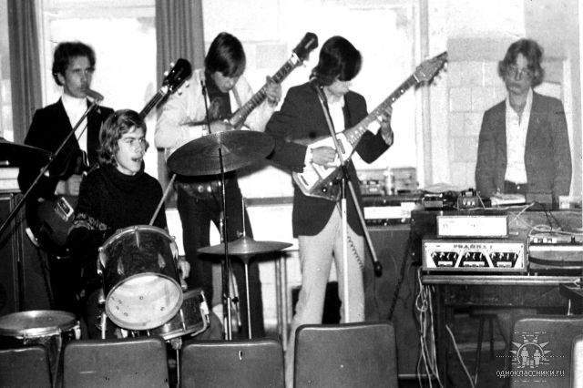 кроме того, видны самодельный дилэй из приставки "Нота", "комбик" "Орфей", усилитель "Родина-1", гитара и бас "Орфей", "примочки" серии "Спектр" (стоят на органе и на "комбике")...