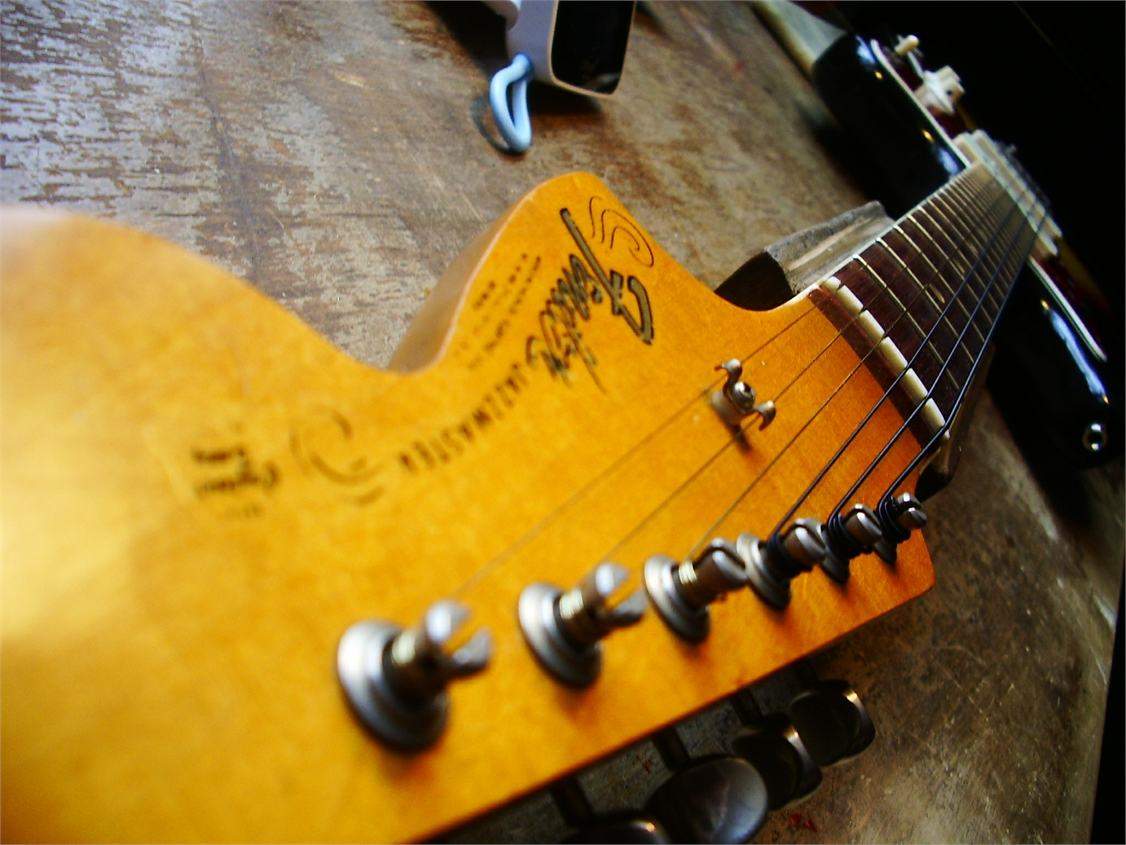 ). Звучит как паршивенький страт, тише нормальной гитары с синглами и тонко, но это временно. Камера мобилы сгладила все коцки и вырванный "с мясом" кусок деки, залитый эпоксидкой, там где чёрная краска) Так что пока он радует меня только..красотой