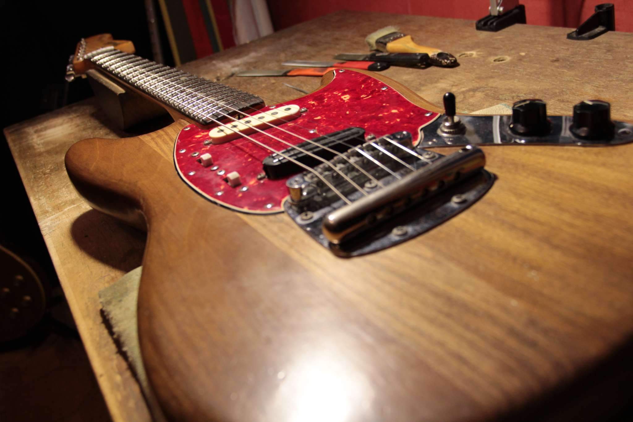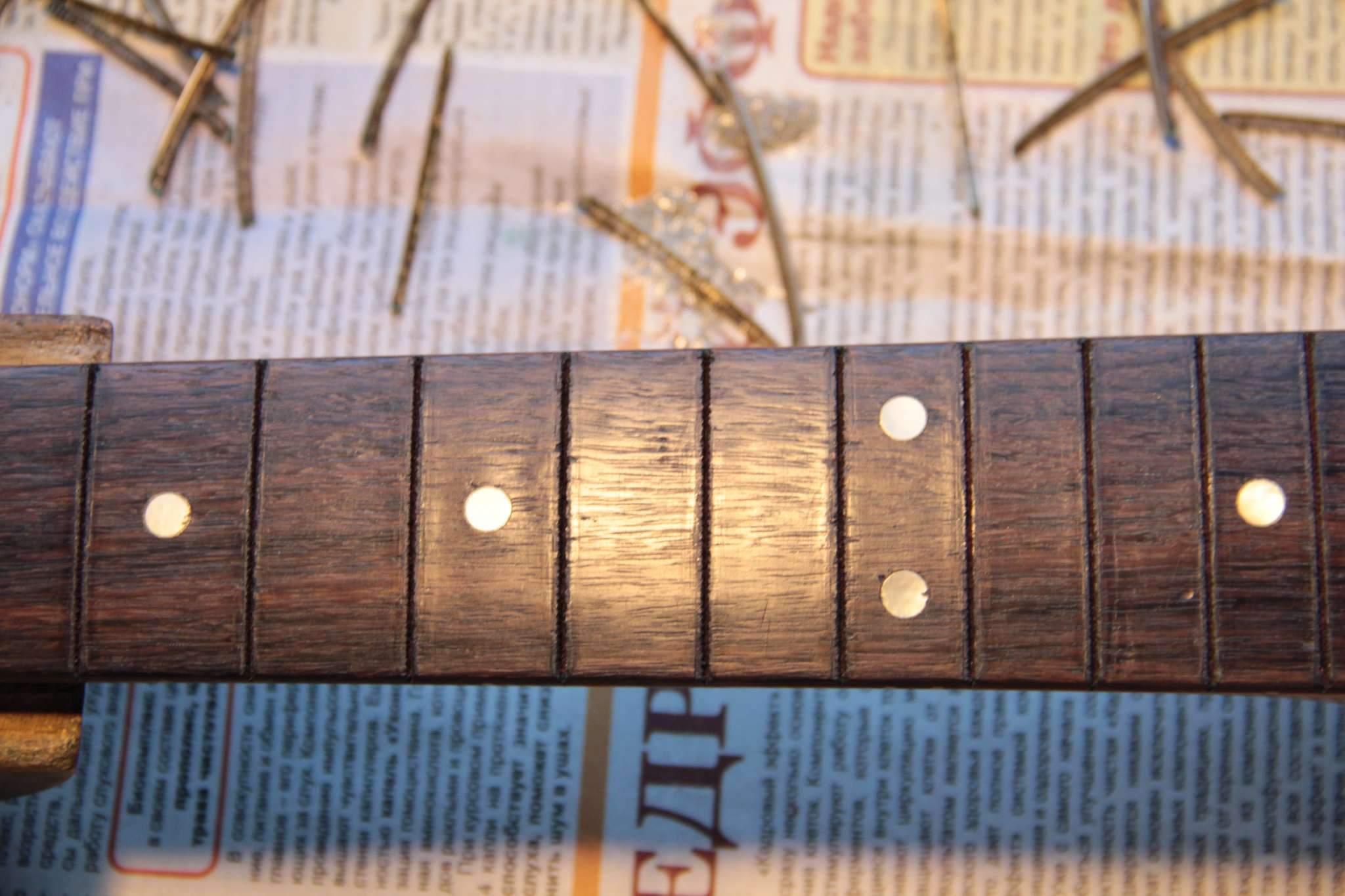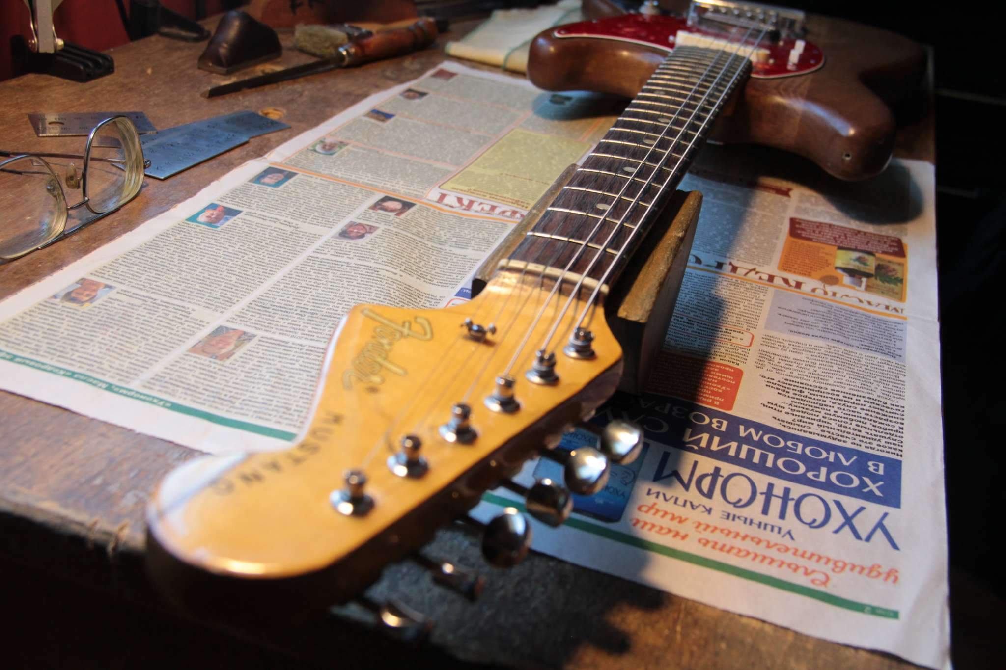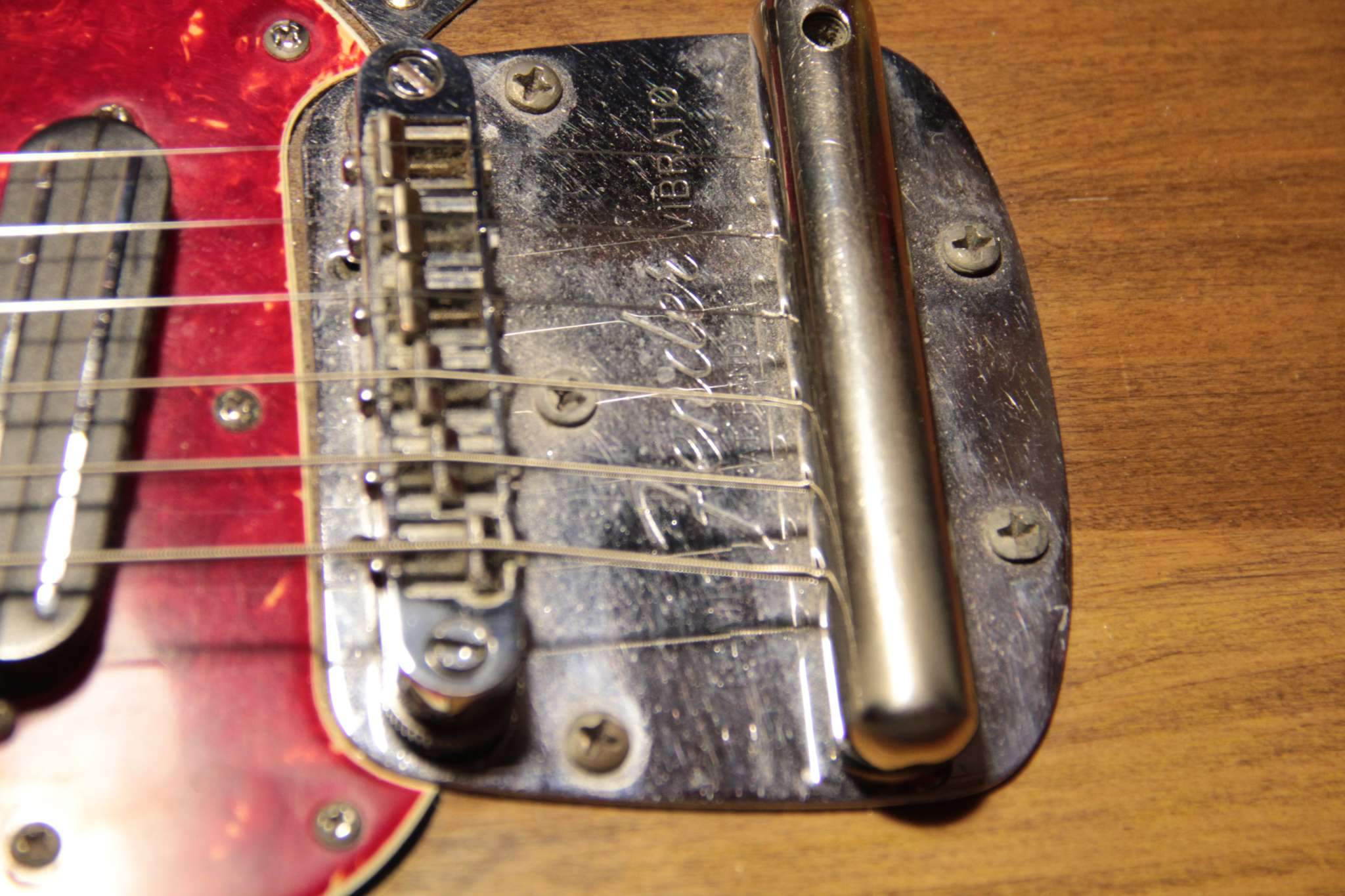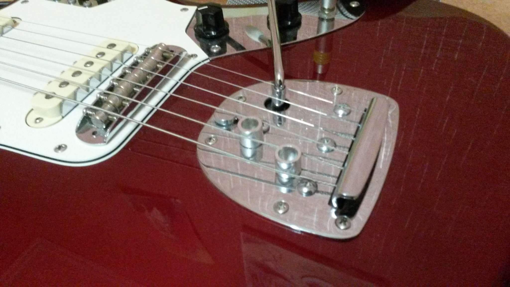 Здравствуйте.Скажите пожалуйста,какой калибр струн Вы используете на Fender Mustang ? Знаком с тем,что 24 мензура позволяет ставить более толстые струны,купил 10-52,настраиваю в стандартный Ми,а струны тянут тремоло машинку за собой в сторону головы грифа,в результате рычаг лежит под углом на струнах,пользоваться им уже невозможно.Пробовал ставить тремоло в разные позиции (вставлен внутрь до упора,поднято на половину,поднято полностью),всё бесполезно,либо рычаг оттопырен от пикгарда вверх и вправо,или наклонён вниз.До этого стояли 9-42,в плане машинки всё было ок,но не в плане удобства игры.Как быть ?