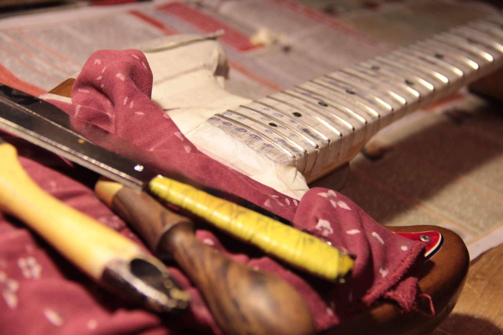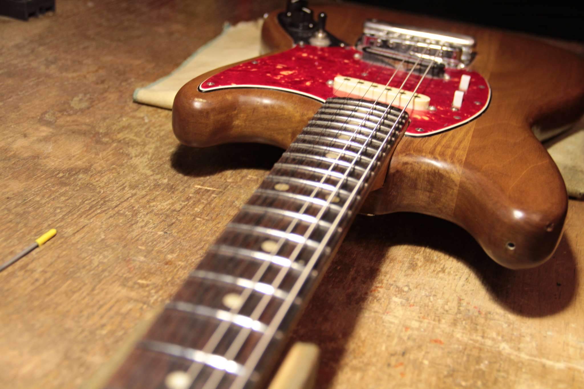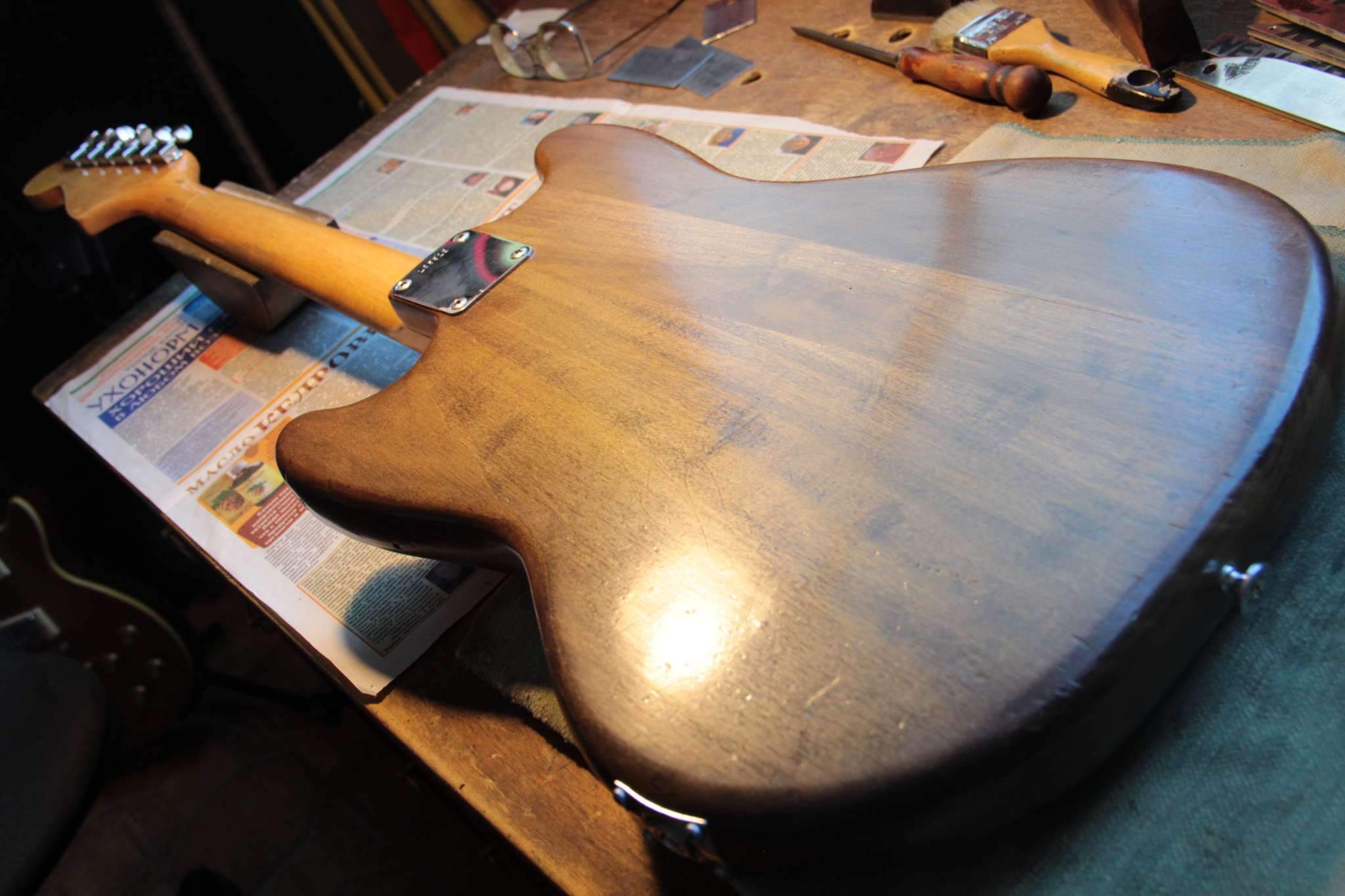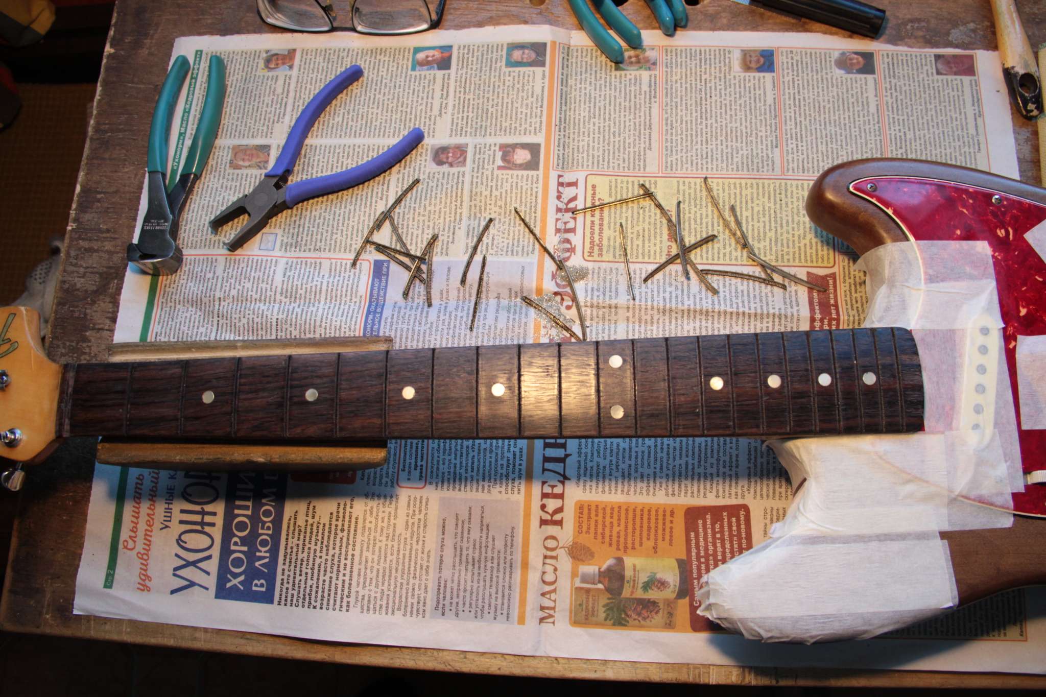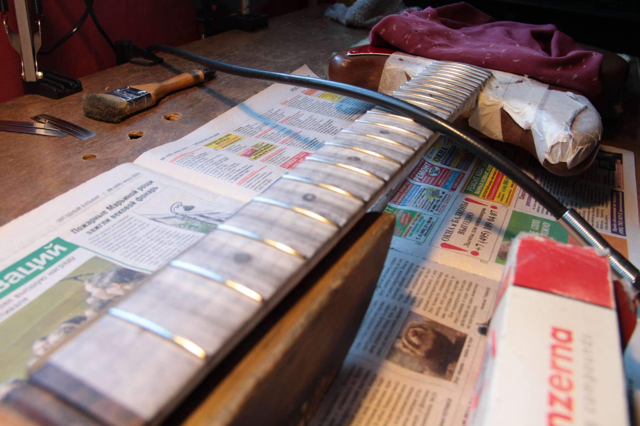 Здравствуйте.Скажите пожалуйста,какой калибр струн Вы используете на Fender Mustang ? Знаком с тем,что 24 мензура позволяет ставить более толстые струны,купил 10-52,настраиваю в стандартный Ми,а струны тянут тремоло машинку за собой в сторону головы грифа,в результате рычаг лежит под углом на струнах,пользоваться им уже невозможно.Пробовал ставить тремоло в разные позиции (вставлен внутрь до упора,поднято на половину,поднято полностью),всё бесполезно,либо рычаг оттопырен от пикгарда вверх и вправо,или наклонён вниз.До этого стояли 9-42,в плане машинки всё было ок,но не в плане удобства игры.Как быть ?