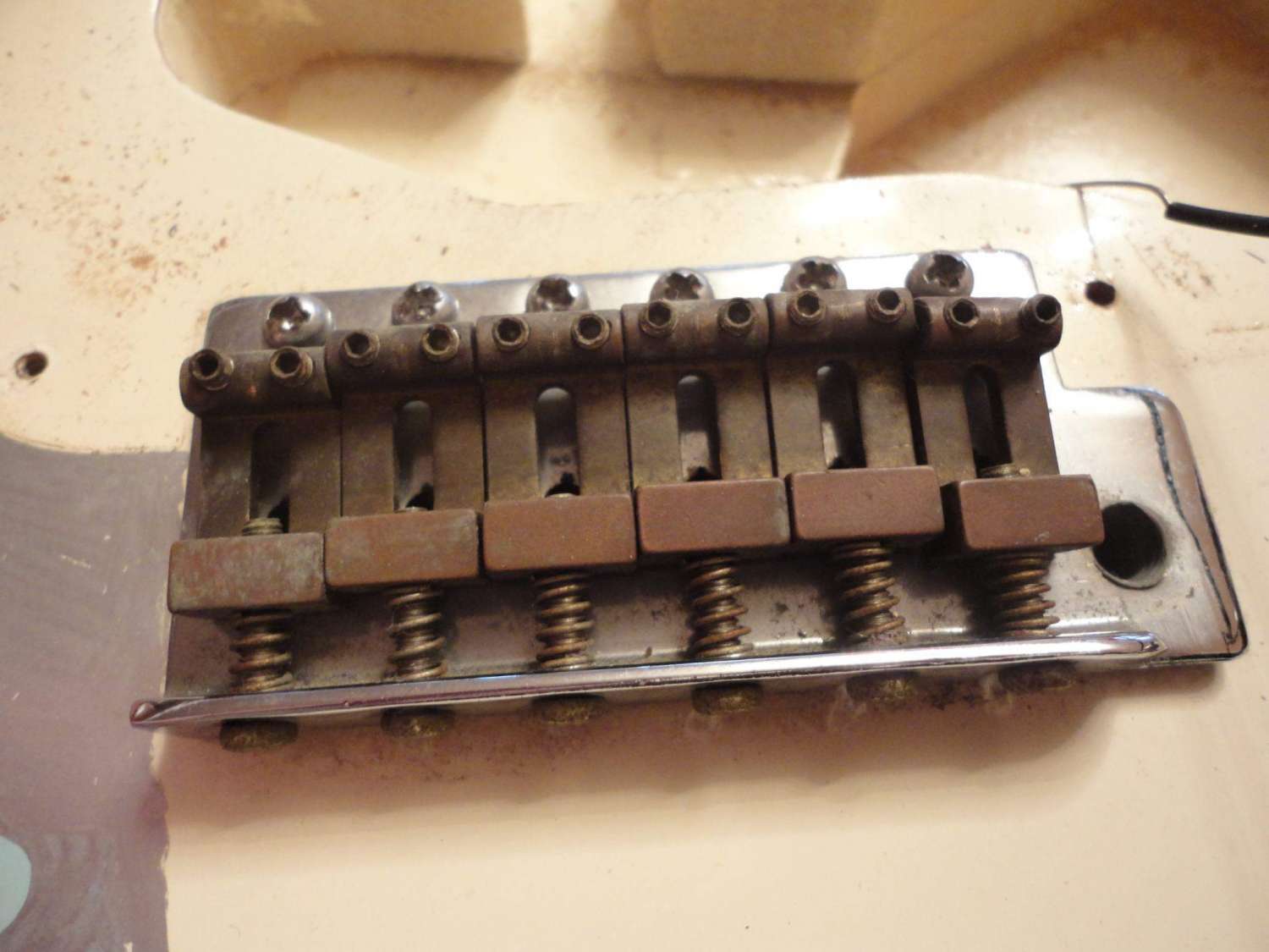 Хрен с ним грязный, но есть то, чего я никак не ожидал. Например, латунные, или бронзовые седла и верхний порожек. Причем, судя по всему заводское-фабричное, при сборке ставилось. Ну про алниковые датчики уже как бы известно, что на них ставились, на 3-ем поколении, но корпус.... Я искал следы склейки, пока не нашел, явных следов не обнаружено, краска не просела, ощущение, что один кусок, ну и самое для меня непонятное, судя по-всему, корпус кленовый. Текстура совпадает с грифовой. Фотки чичас на леплю. Раскидал его родного на промывку и приведение в божеский вид, картинку саморисованную, думаю оставлю...