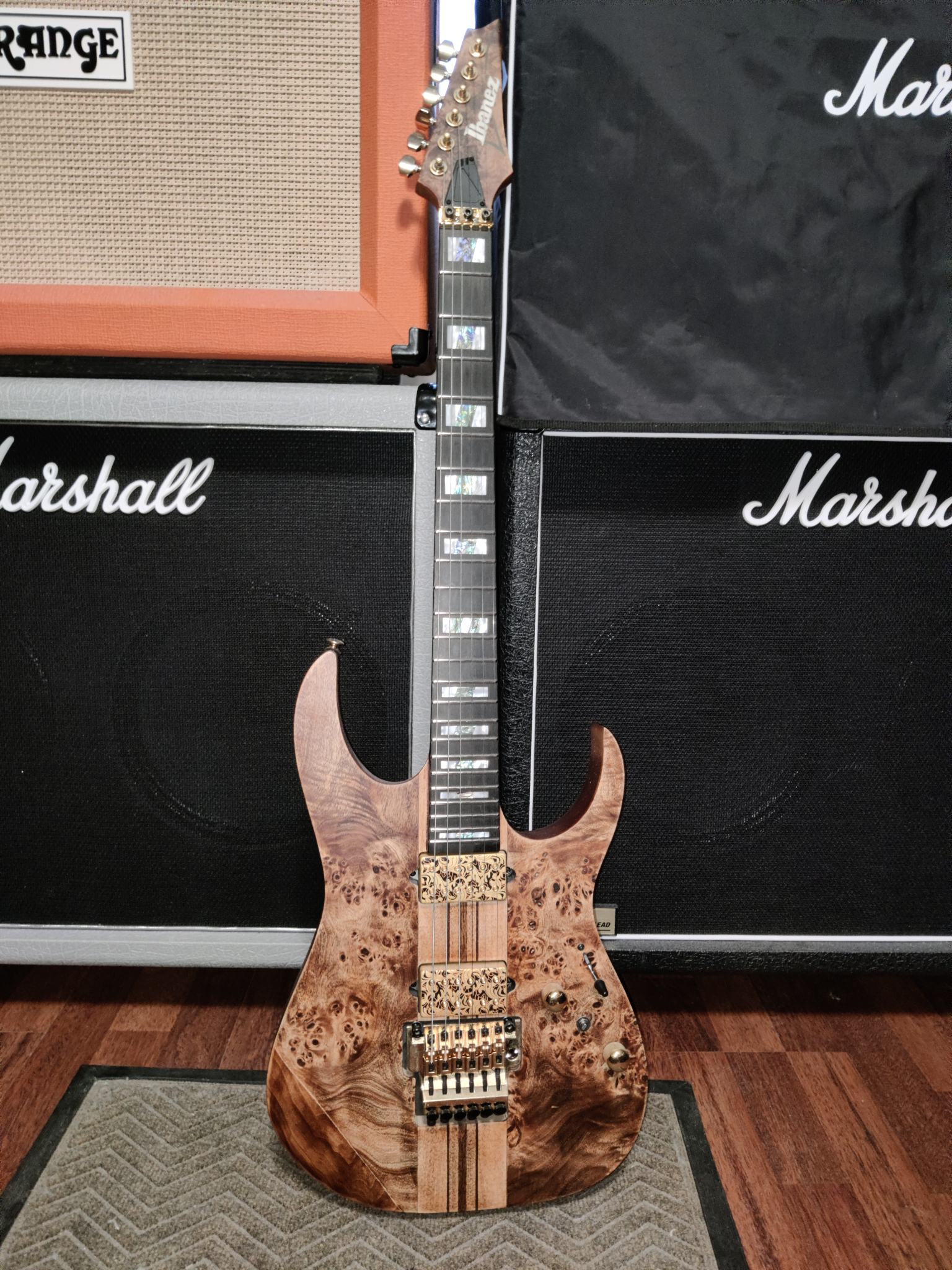 Взял третьего дня Ibanez AZ2402-PWF, давно хотел, смущали известные особенности (выше обсуждали). Первые впечатления крайне положительные - исполнение, звукосниматели - огонь. Легкий, ольха резонирует. В два разных аппарата пробовал (хайген и маршалоид), оба заиграли, что не на всех инструментах бывает. Толщина грифа не напрягает, чуть толще Wizard III, что не особе заметно. Лады идеальные, машинка супер, флажалеты высекаются огненно (не знаю в чём дело, на RG550 стараться нужно искать). Причём чуть не взял уже Jackson American Series Virtuoso (всегда нравились джексоны по профилю грифа и эргономике), в последний момент решил - топовый AZ лучше середины Jackson. Последней каплей были лады и машинка, а вариант HT Jackson как-то не по фэншую.