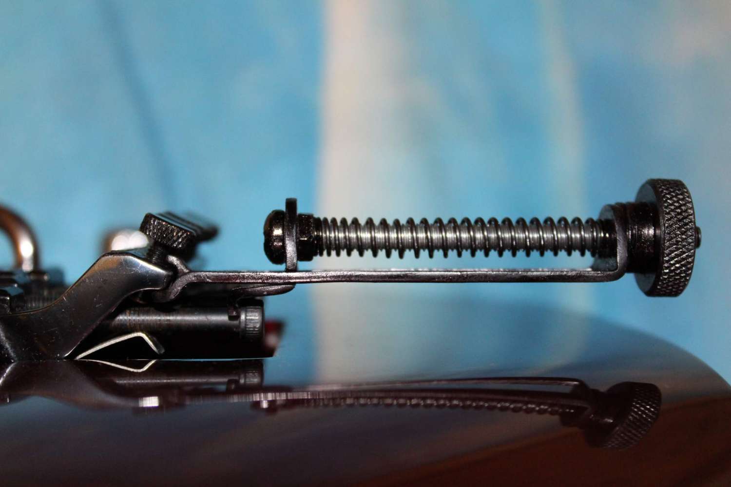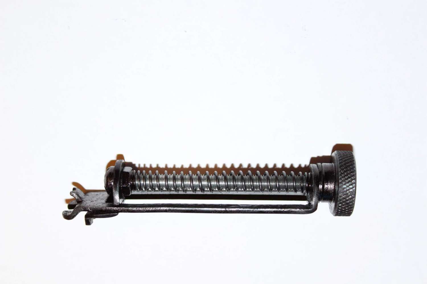 Хочу немного поделиться результативным рабочим днем. Нашел вчера на работе точеную гаечку с насечкой и резьбой 5мм. и взял винтик с такой же резьбой, после чего очень долго игрался с ними накручивал и скручивал. Вдруг меня посетила мысль, а почему бы не попробовать сделать приспособление для настройки мензуры которое уже давно собираюсь купить да все как-то дело до покупки не доходит. Пошел, порыскал по стеллажам подобрал подходящую пружинку отрезал полоску метала толщиной 2мм. и приступил к делу. Спустя пару часов кропотливого труда и с помощью тисков, дрели, молотка и напильников получилось данное устройство. Делал все по памяти, так как померить флойд не было возможности.