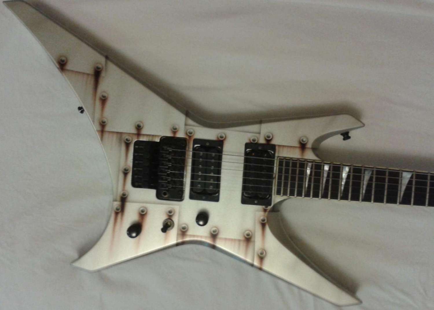 Итак расскажу почему я выбрал именно этот вариор болтед стил , а не какой нибудь другой , хоть сейчас и лежит такой же болтед стил у нас в коммерце , посмотрев несколько этих гитар я увидел что они очень сильно отличаются по рисунку , все три гитары фотки которых я видел имеют различия , а значит скорее всего они красятся в ручную , на третьей фотке гитара с нашего коммерца , при взгляде на неё мне показалось что-то странным , потом я понял что это гигантские клёпки несоразмерные с размерами нарисованных листов , да и с самой гитарой то же , это даже скорее не клёпки , а дырки от пуль из которых течёт кровь , но не суть , может кому-то это даже понравится больше , но мне как человеку немножко интересовавшемуся раньше бронетехникой это кажется несуразным , вторая гитара с сайта самого джексона мне так же чем-то показалась странным , а именно отсутствием тонировки по краю металлических пластин , то-есть клёпки загажены , а щели очень мало , это то же несуразица , а вот та "ржавая" гитара которую я купил из этих трёх вариантов лучшая , всё очень жизненно , да и при просмотре более хороших фотографий повреждения минимальны и не так страшны , как это ни странно , но износ минимален , продавец написал что отыграл на ней несколько концертов , и только , так что износ минимален , лады оригинальные , с ржавчиной непонятно , но он написал что она стирается тканью , когда гитара приедет посмотрим что к чему , по крайней мере всё железо можно относительно недорого сменить , а вот качество рисунка не сменишь .