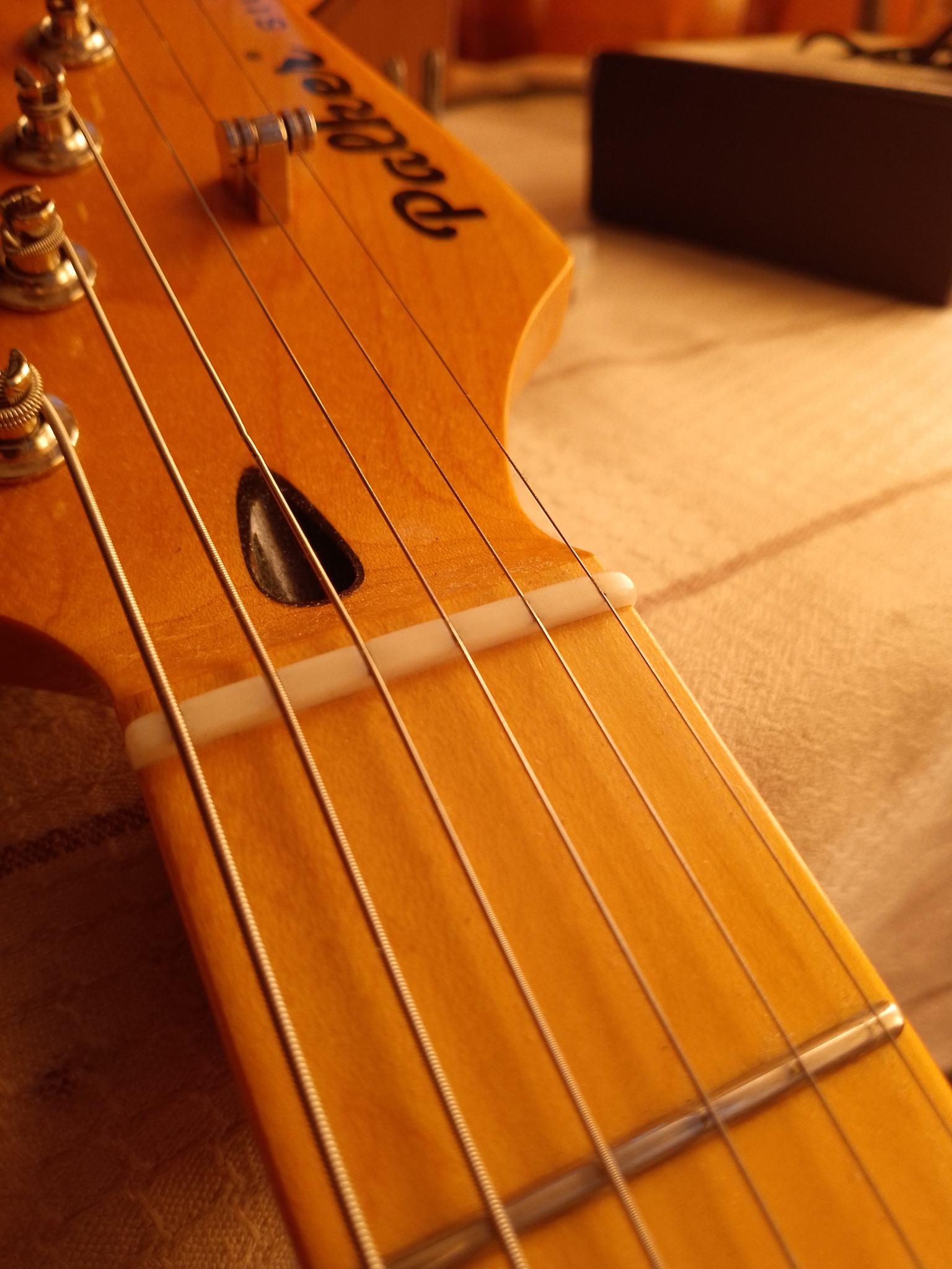 Порожек выглядит как искусственная кость, по твёрдости показался тверже натуральной кости. У меня претензий не возникло ни к материалу ни к обработке. Глубина и ширина пропилов норм, струны в них не тормозят. Менять на что-то смысла не увидел. Просто чуть шлифанул и смазал пропилы. Ну и пару капель клея в паз чтоб порожек не ездил.