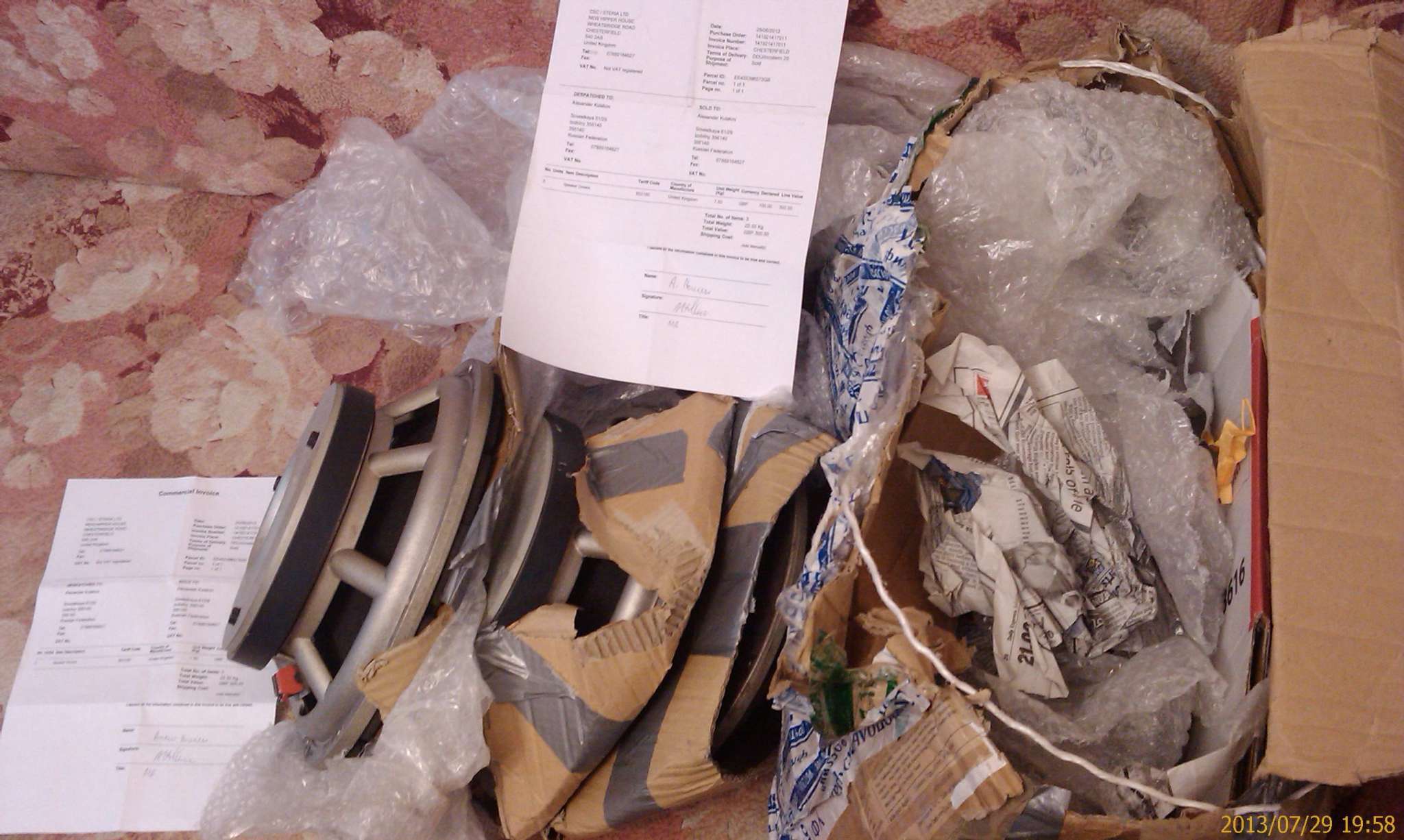 . Коробка так же была повреждена , на почте при получении составили акт , но сказали , что во всём вина отправителя . Правда продаван вернул часть денег за один динамик , но и то после того как я на него наехал и предоставил видео и фото материалы , плюс скан акта .