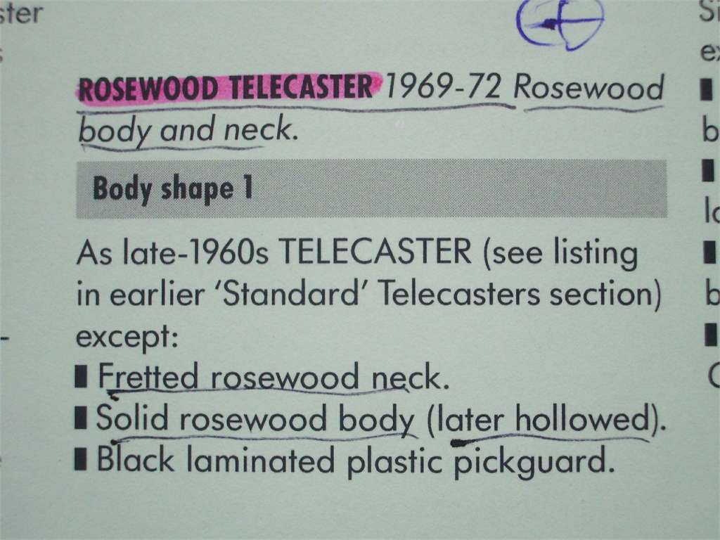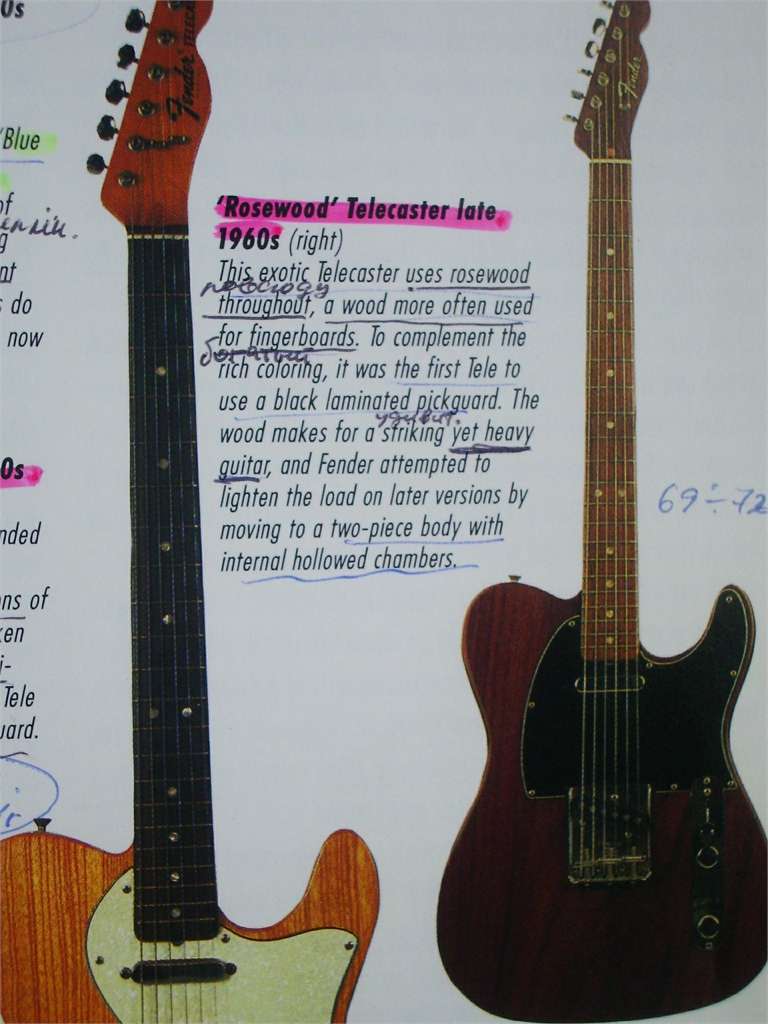 Компания Fender в конце 60х годов боролась за рынок, как и все остальные, при этом она выпустила несколько новых моделей телекастеров в 68-69гг. Это были Telecaster Thinline, Telecaster Paisley Red и Blue Flower, и третья модель - Telecaster Rosewood. Естественно, они хотели, чтобы современные звезды использовали их инструменты. На Фендере в 1968 году было сделано два палисандровых телекастера и в 1969 два стратокастера. Лучший из телеков презентовали Харрисону, лучший из стратов предназначался Джими Хендриксу. Разработал их немецкий мастер Roger Rossmeisl, а сделал небезизвестный Philip Kubicki, он очень старался..)) Телекастер Харрисона был сделан целиком из розового дерева, корпус распилен вдоль пополам и вставлена прослойка клена (как делал корпуса Гибсон в 69-76гг), гриф имел отдельную приклеенную накладку из палисандры, позже стали делать гриф из одного куска. Корпуса вначале были сплошные и очень тяжелые, позже стали делать с полостями..
