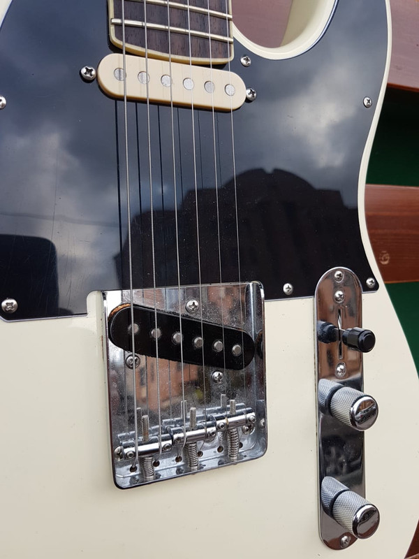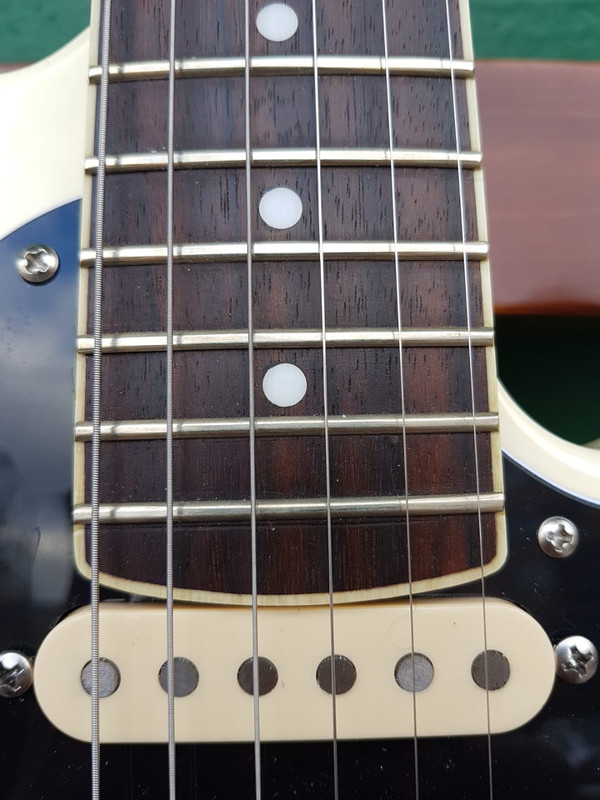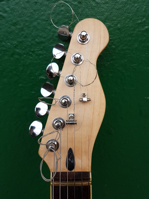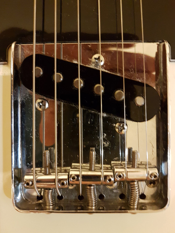 Ещё у этой мастеровой гитары я нашёл один секрет - в сёдла болты вкручены по резьбе не под прямым углом, а немного наискосок, так что пары 1-2, 3-4 и 5-6 струны имеют немного разную мензуру, как это обычно и бывает на 6-сёдельном бридже. Стоит идеально. Не знаю, сделал ли это мастер сам, или использовал готовые сёдла, но я раньше про такую хитрость не знал.