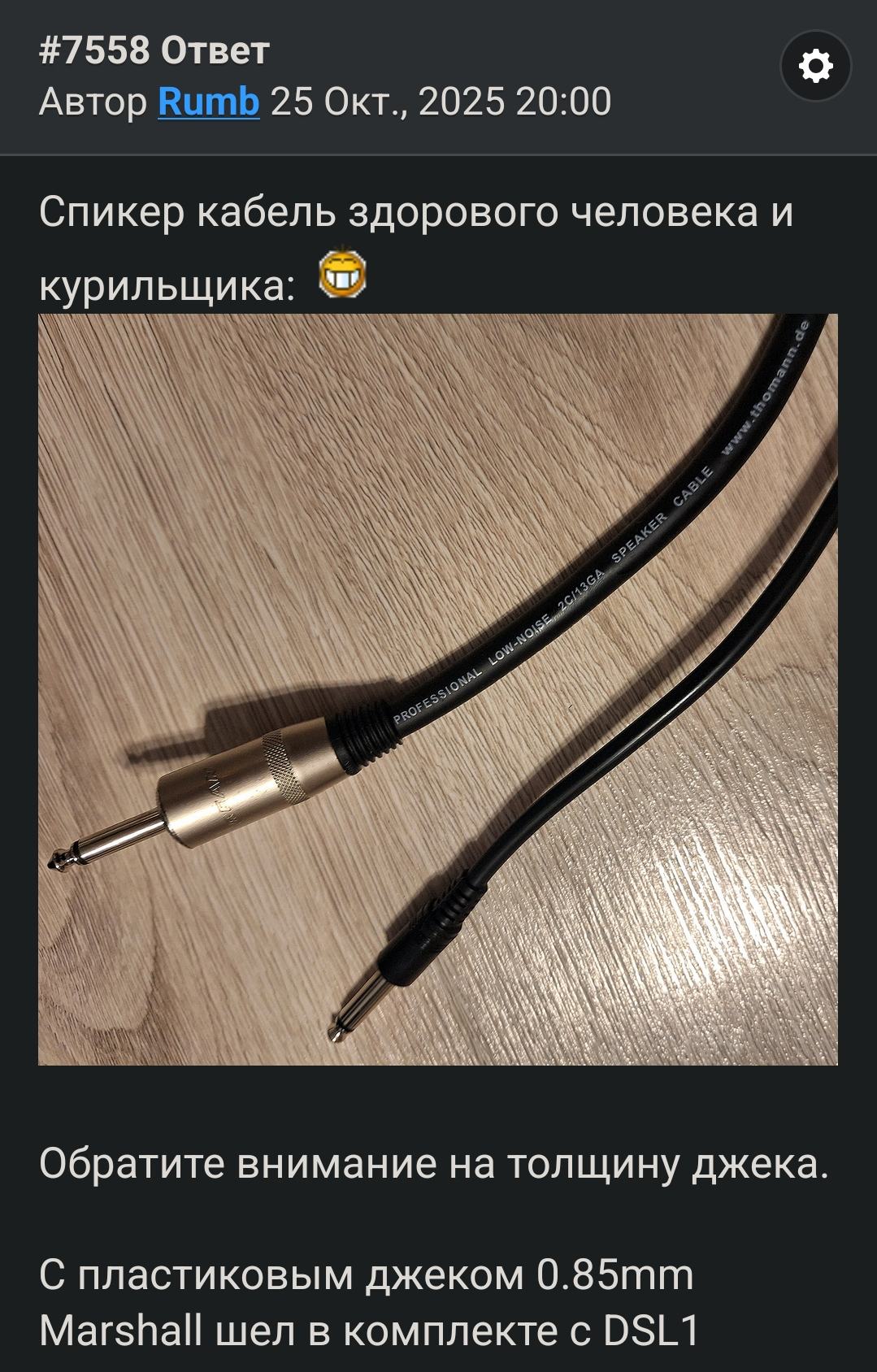 Я такой кабель с такими джеками первый раз вижу, вот и сфоткал. Сам я использовал\зую 2х1кв мм от Makita в резиновой изоляции. При длине до 2м на домашней громкости достаточно. И в звуке я разницы с этим монстром не замечаю. Кстати, в этом монстр кабеле изоляция просто очень толстая и резиновая, даже на холоде не дубеет абсолютно, а сами провода, как и написано 1.8-1.9квмм. Этот толстый кабель продавец DSL1HR не пожалел подкинуть в комплект.