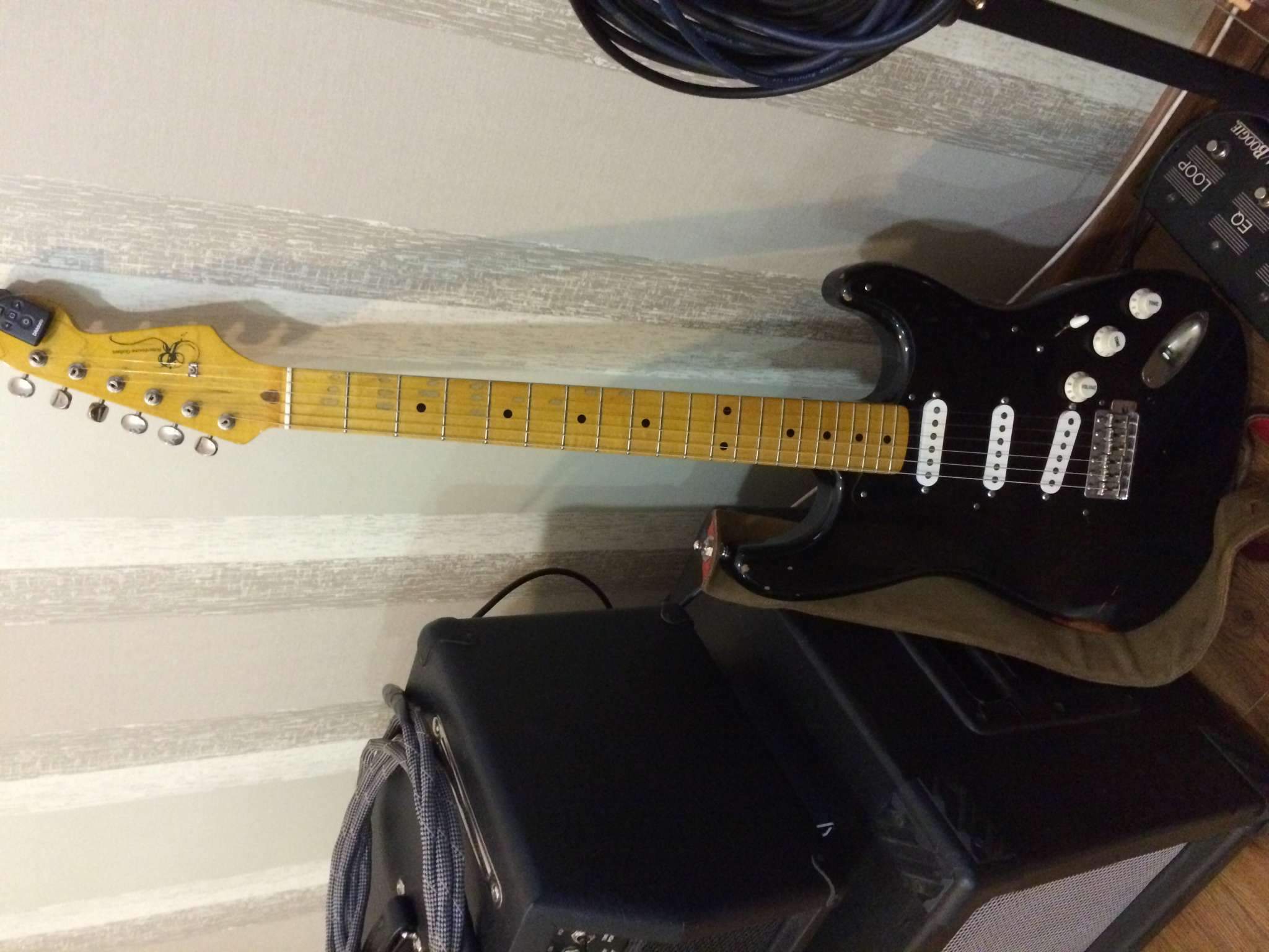 Норма-ал! Посравнению с рядом Нэшей этот просто красавчик... Это 70's Strat. Датчики - Dimarzio DP-415,407, 404; тремоло - какой-то дорогой Wilkinson со стальным килем, колки локовые... Железо менял не я, до меня.