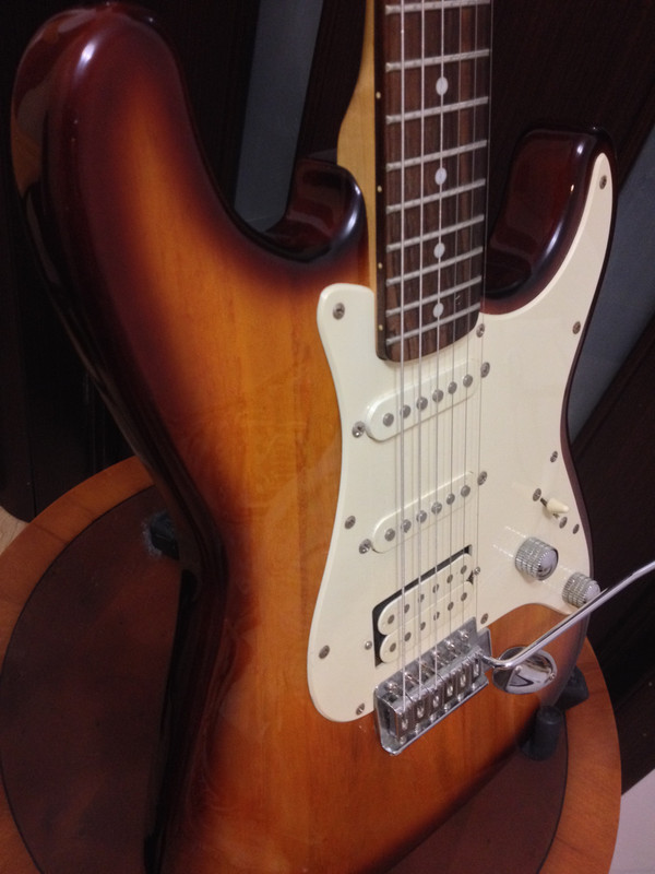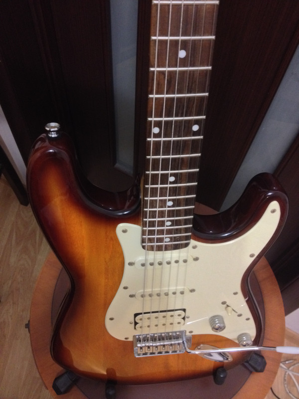 Это самая легкая гитара по весу из всех, что мне приходилось держать в руках,завез гитару к мастеру для полного сетапа (другому, без линейки который )он был сильно удивлен: тоже не ожидал, выглядит гитара массивно,что за дерево он так и не понял - выглядит вроде как ясень, по его словам,однако вес менее 3кг (я сравнивал с своим Фендером и с VOX - SG, Vox указана производителем как 3кгэтот страт однозначно легче) (нажмите чтобы показать/спрятать)... и добавил:да прям...готово кино ... и добавил:Переключатель 5и позиционный2 сингла + хамбЕсть пуш-пул для отсечки хамба в синглреализован поднятием ручки требле вверхВизуально мне сами крутилки не понра, какие-то металлическиеоднако я понял мысль производителя, когда поднял пуш-пул вверх:они ребристые, и это делать удобно.Одна громкость + один тембр.