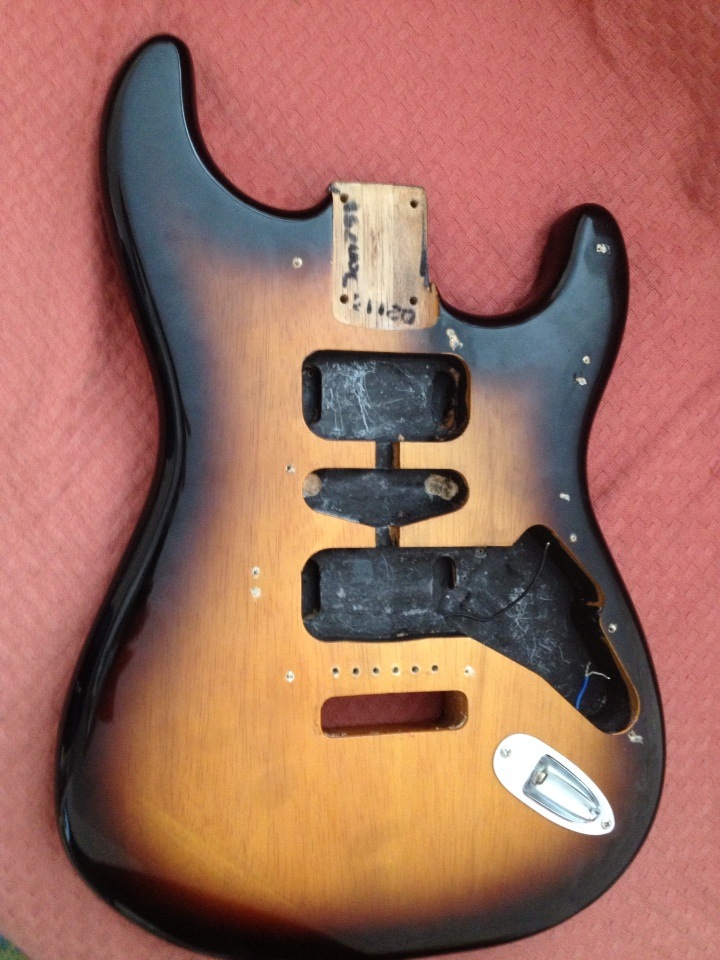 Тремоло установлено с фендеровского The Strat. Для этого пришлось немного скорректировать имеющиеся отверстия под винты. Оно так же 6 винтовое, но вот пара последних отверстий немного не совпадали со станиной. Я их залил эпоксидкой, вставил чопики и заново высверлил отверстия, как мне было нужно.