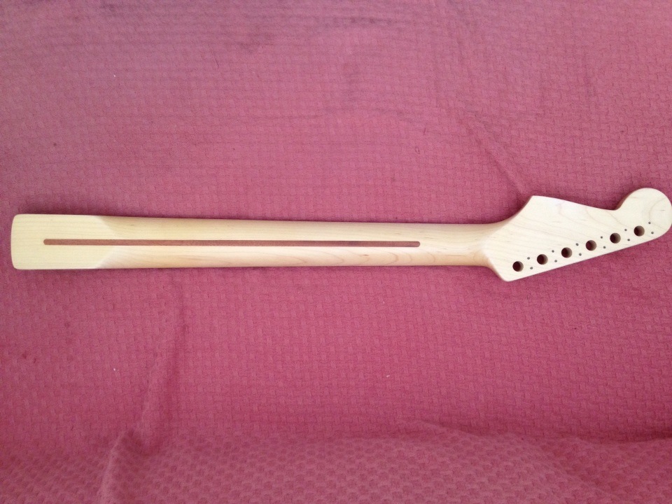 Гриф был взят на ибее, 21 лад, частично из-за цены, стоил он не очень дорого, плюс продавец любезно согласился отправить его в Россию. По утверждению владельца, гриф мастеровой, клен + палисандр. Решающим фактором при его выборе стали высокие и толстые лады (нравятся мне такие) и его толщина: он достаточно тонкий, примерно такой же, как на джексоне. Когда вскрыл посылку, я, честно говоря, был немного удивлен в хорошем смысле - сделан гриф действительно очень качественно, и уж точно не похож на китайца с али. Очень приятный на ощупь, лак очень тонкий, разве что на голове слой немного толще. Маркеры, кстати, сделаны из натурального перламутра, я таких на китайцах не видел ни разу. Хотя, может и научились делать, кто знает. Порожек, к слову, сделан из кости.